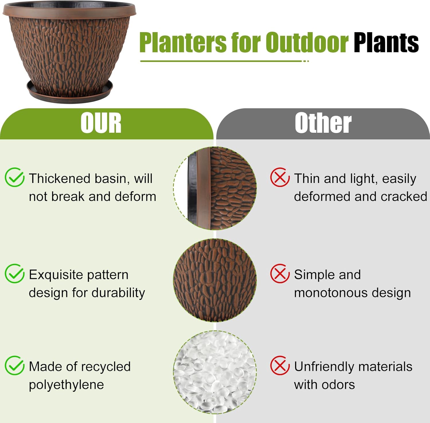 - 【Thicker/More Weather Resistant】 Planters for outdoor plants are made of sturdy recyclable plastic, thick and durable for years. Plastic plant pot built to withstand intense sun and harsh winter temperatures, free from fade, frost, crack and peel damage, allow you to enjoy these in all types of weather, indoors and outdoors freely.
