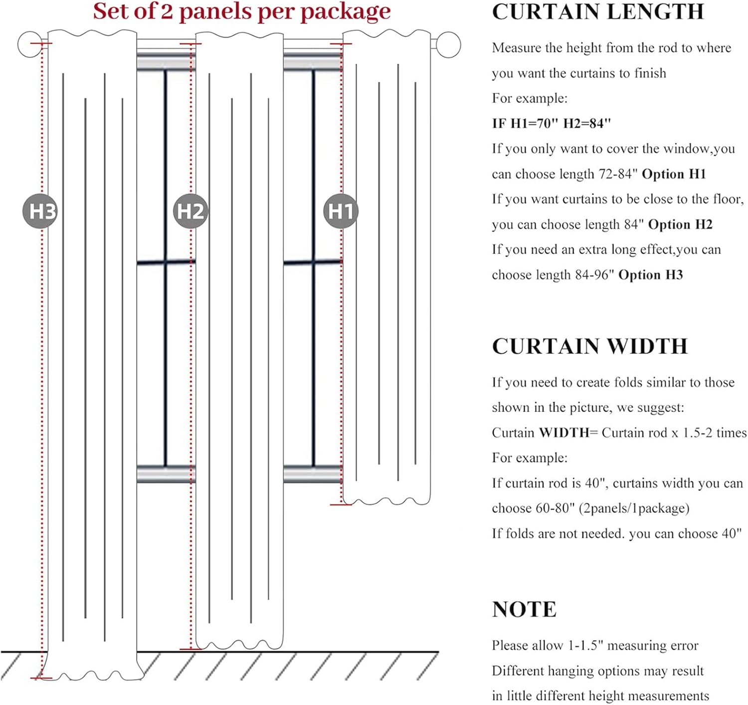 - Ready Made:Set of 2 pinch pleated curtain panels per package with 16 metal rings and 16 adjustable plastic hooks(The adjustable hook can raise and lower the height of the curtain by 1 inch),Each panel measures 40"W x 45"L,pair measures 80"W x 45"L