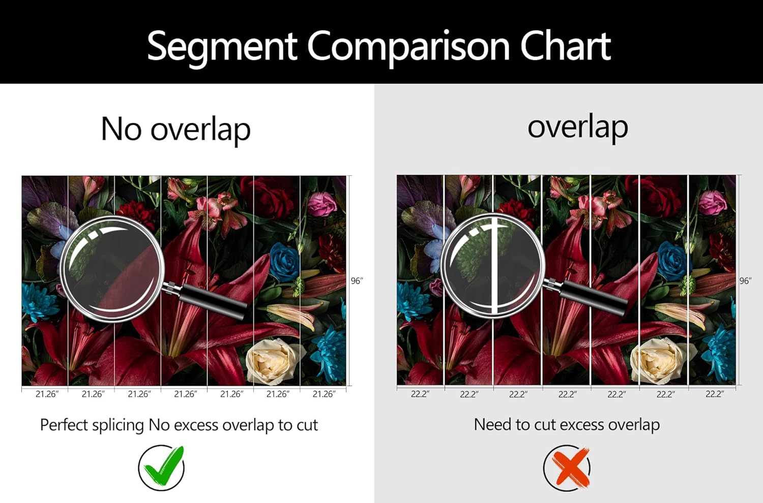 - Mural Size: The total size of this mural wallpaper is 149" x 96" / 378CM x 244CM (W x H), cut into 7 pieces, each measuring 21.26" x 96", for easy installation.