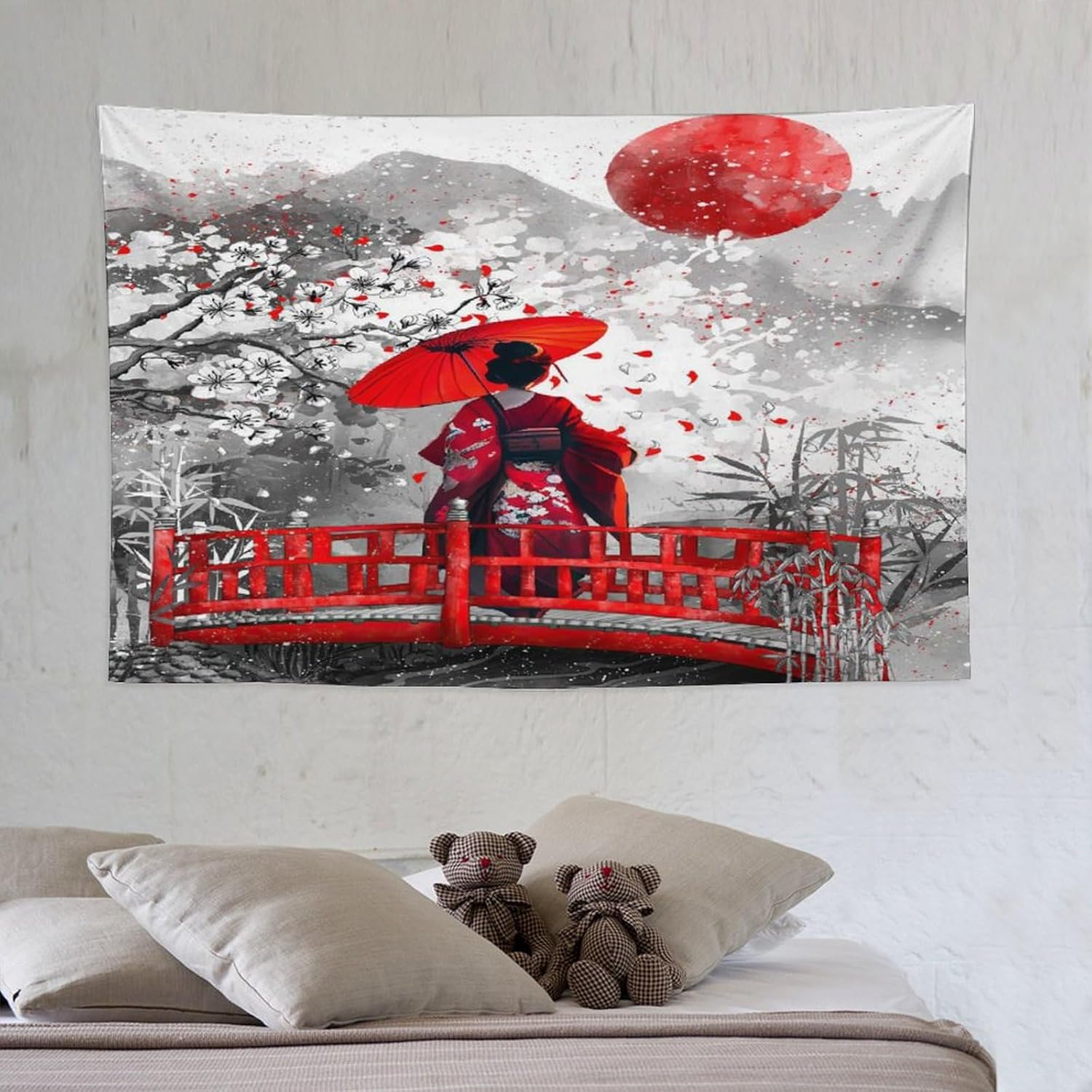 Japanese Red Geisha Tapestry Asian Cherry Blossom Red Sun Traditional Kimono Folk Tapestries Home Decor for Living Room Bedroom Apartment Farmhouse Dorm 60"x40"
