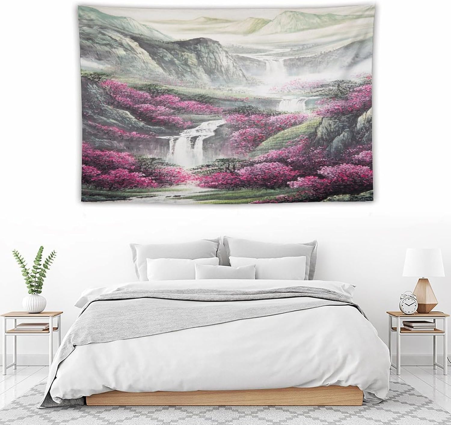 Japanese Tapestry, Red Plum Blossom Mountain Tapestry, Asian Japanese Wall Tapestry, Nature Landscape Tapestries for Bedroom Living Room Decor 90"x60"