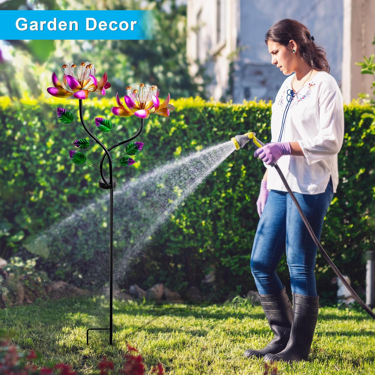 55'' Solar Powered Kinetic Wind Spinner Sculpture Pink Lotus Metal Stake Spinner for Patio, Lawn and Garden Decor Weather-Resistant Outdoor Art with Dual Lotus Design