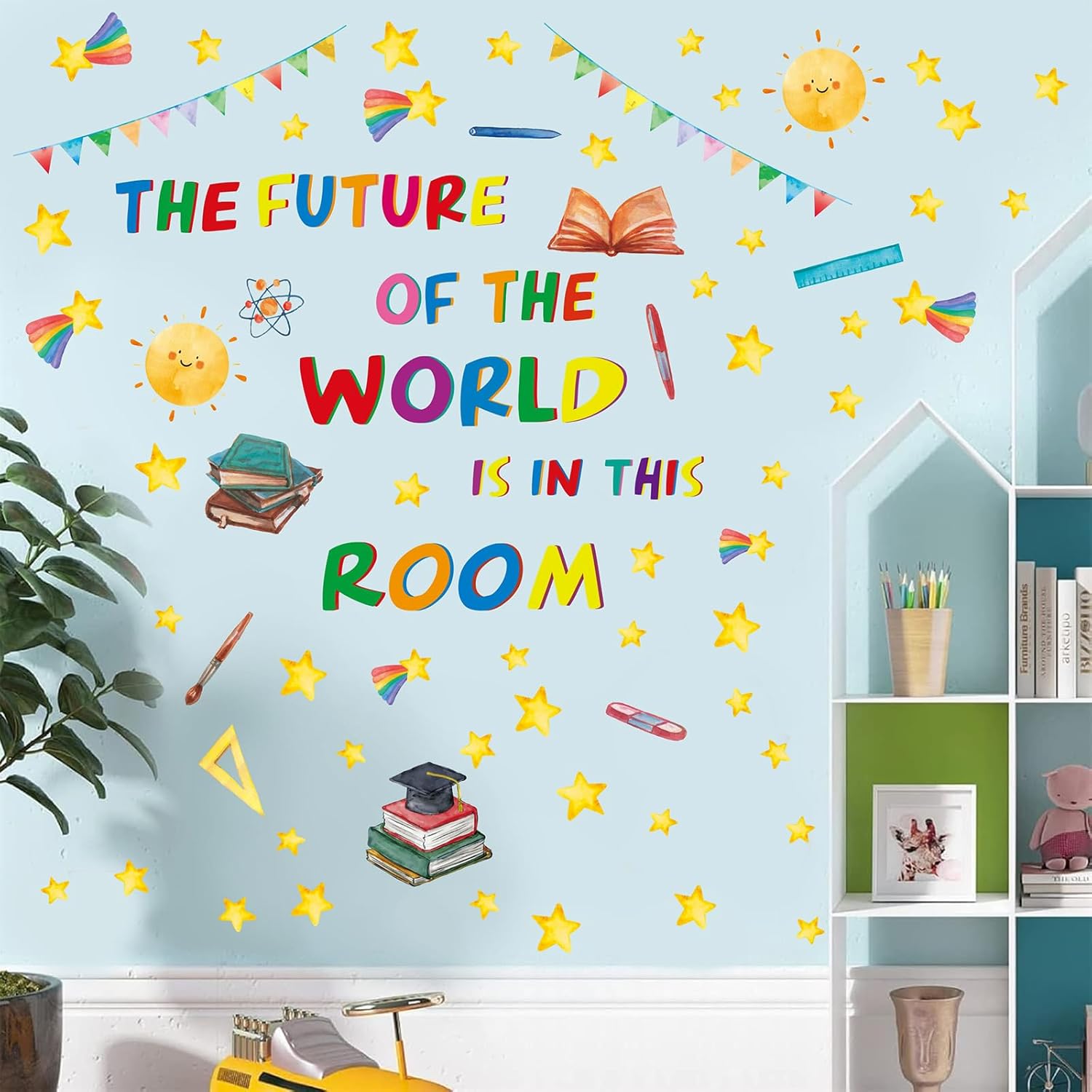 - Colorful Inspirational Wall Decals: This positive saying window clings is mainly composed of various learning element,such as pencil,books,rulers,sun,rainbow,graduation hat.With the sentence[THE FUTURE OF THE WORLD IN THIS ROOM].This colorful sticker will add learning and thinking atmosphere to class.This is a great gift for friends,child or teacher