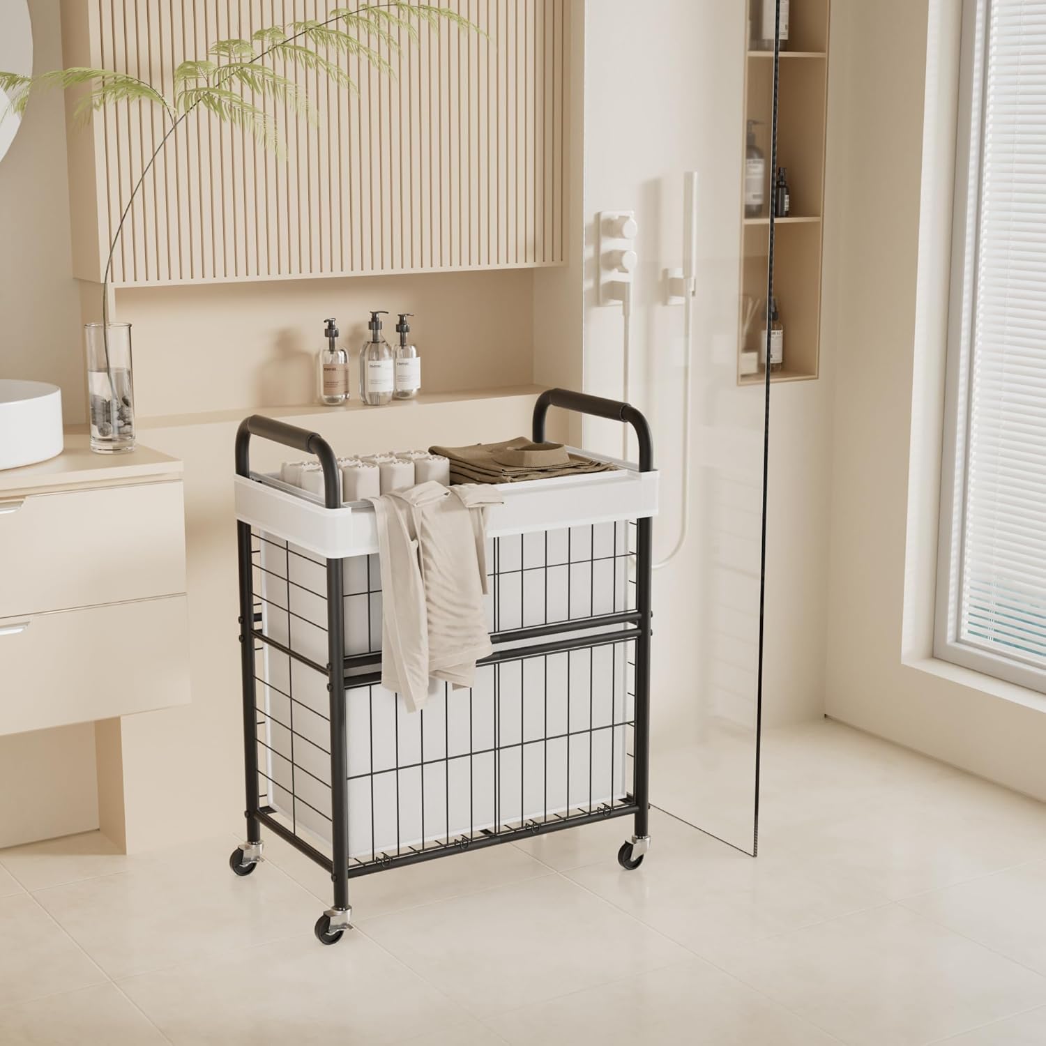 - Premium Quality Materials Laundry Hamper with 2 Compartment: The wheeled laundry sorter cart's frame is high-strength steel with an anti-rust surface. Laundry basket is made of thickened oxford fabric.