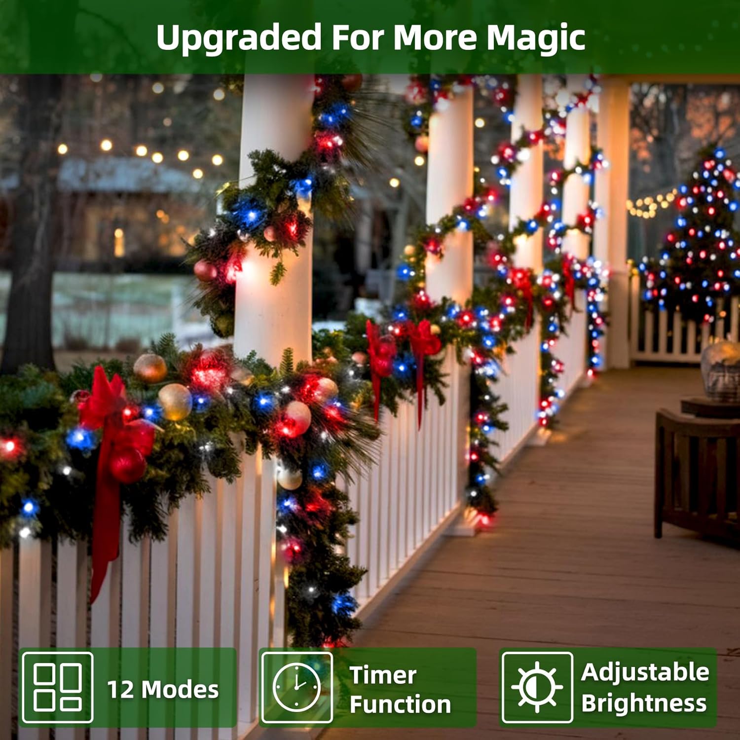 300LED Christmas Lights Outdoor Indoor Use, 12 Lighting Modes 75ft Christmas Tree Lights with Timer, Dimmable Plug in Red White and Blue LED StringLights Waterproof for Yard Tree Wedding Party Holiday