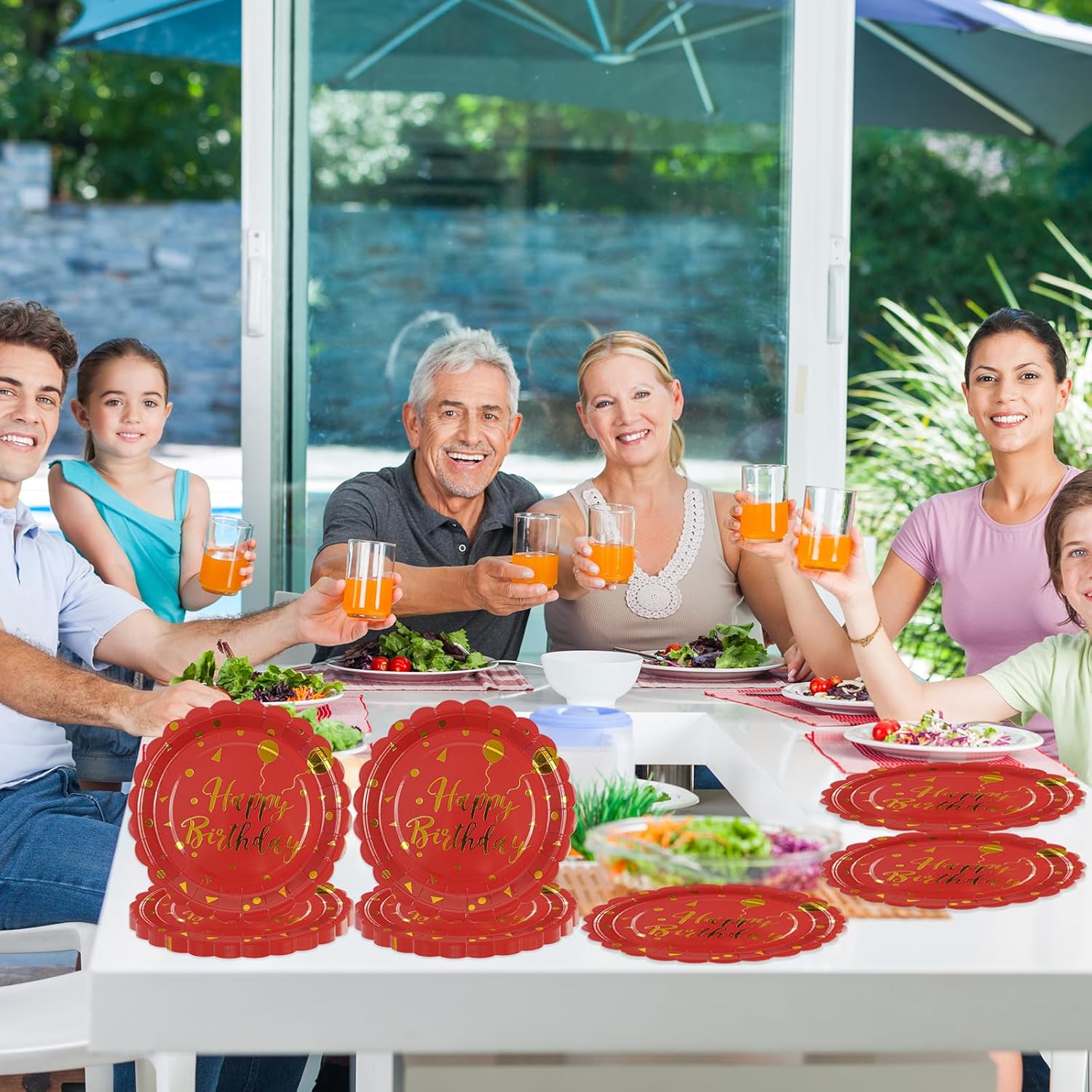 - 【MEMORABLE OCCASIONS】: Red birthday plates is great for every ages, the color red makes people feel warm and joyful, ideal for 21st birthday party, 30th birthday party, 40th birthday party, 50th birthday party and more, whether it's a boy, a girl, a man, or a woman you can brighten up the table with red birthday paper plates, now spread your joy to your guests!