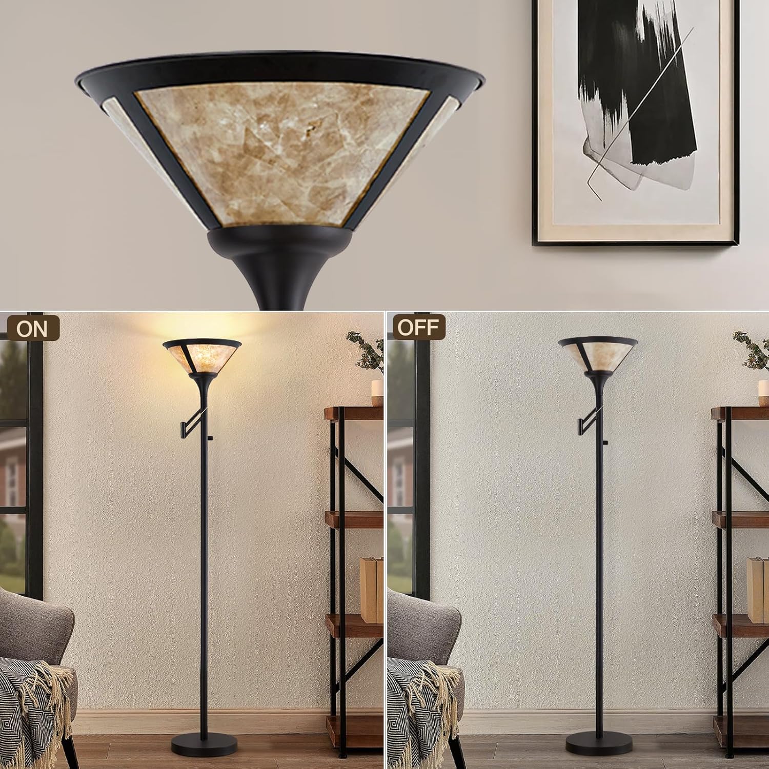 Floor Lamps for Living Room - 70" Black Torchiere Standing Floor Lamp with White Mica Shade - Tall Corner Lamp Decor for Bedroom with Adjustable Swing Arm LED Reading Light for Home Office