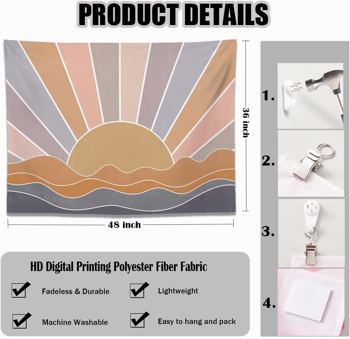 - Boho Sun Tapestry: Brighten your space with this vibrant sun tapestry featuring a retro 70s rainbow design. Perfect for adding boho aesthetic to bedrooms, dorms, or living rooms