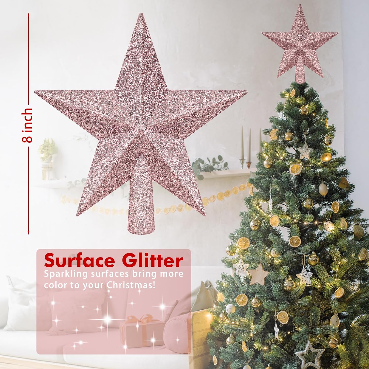 Tree Topper Star, 8" Rose Gold Christmas Star Tree Topper Accessories, Xmas Glitter 3D Bethlehem Tree Topper Ornament, Waterproof Holiday Christmas Tree Topper Star Decor for Home Indoor Outdoor