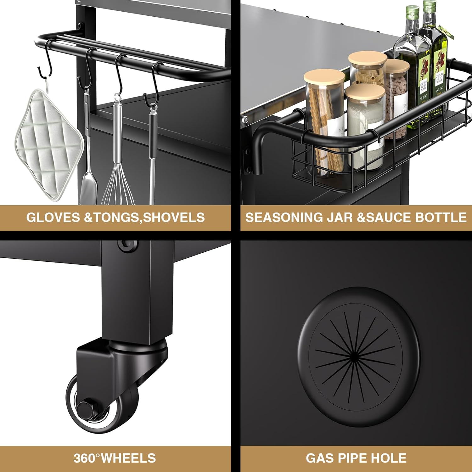 - Multi-functional Design: Our outdoor kitchen rolling bar cart is thoughtfully equipped to cater to all your daily needs; It features a convenient spice rack, towel rack, armrests and 4 S-shaped hooks to meet your daily needs of use.