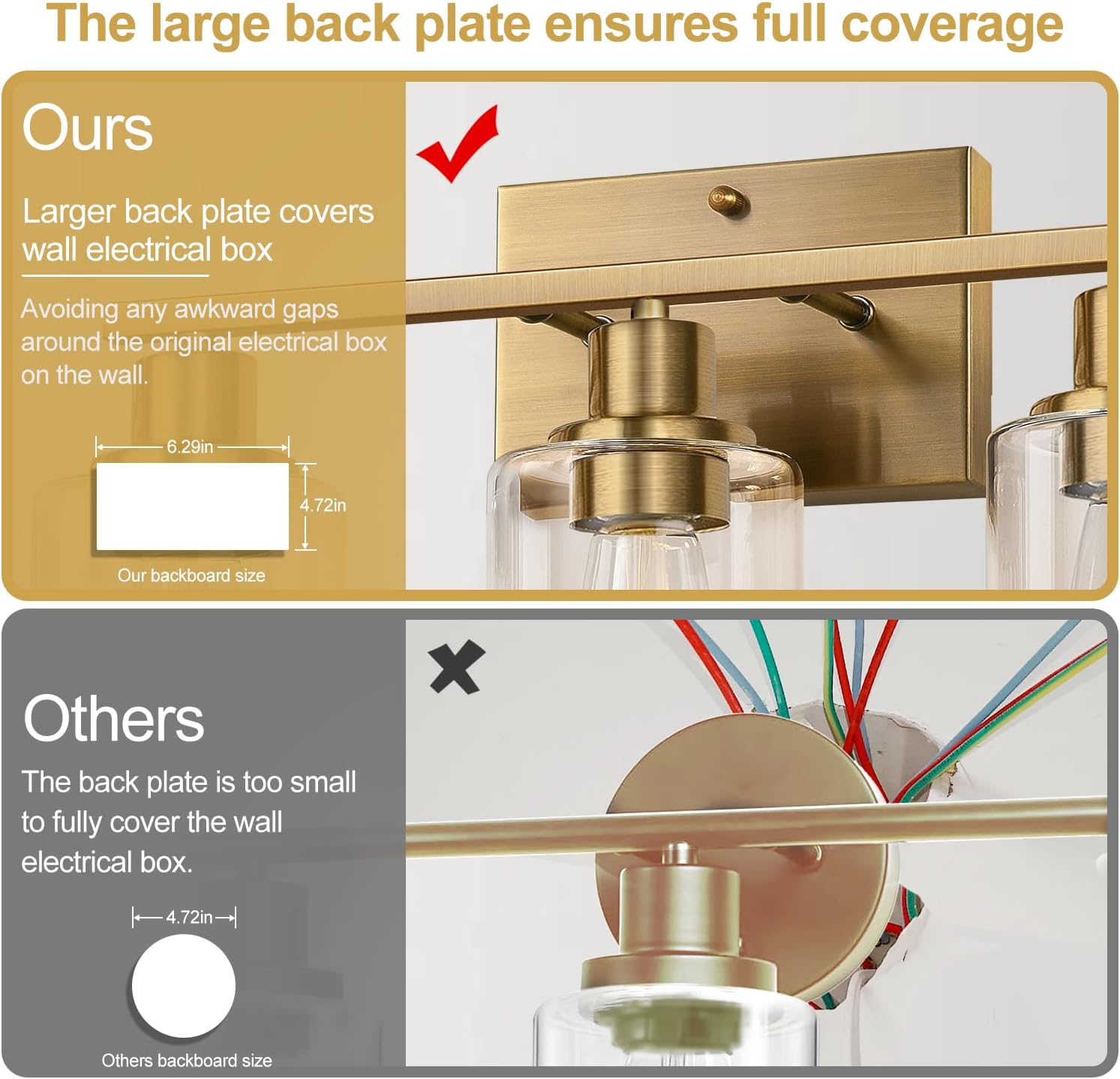 - Timeless Brushed Brass Finish: Elevate your space with this vanity lighting fixture, featuring a sleek brushed brass finish and clear glass shades. The warm, vintage brass tone adds a touch of classic elegance, while the upgraded scratch-resistant and tarnish-resistant coating ensures it maintains its pristine appearance over time. Perfect for modern, farmhouse, or retro-inspired decor.