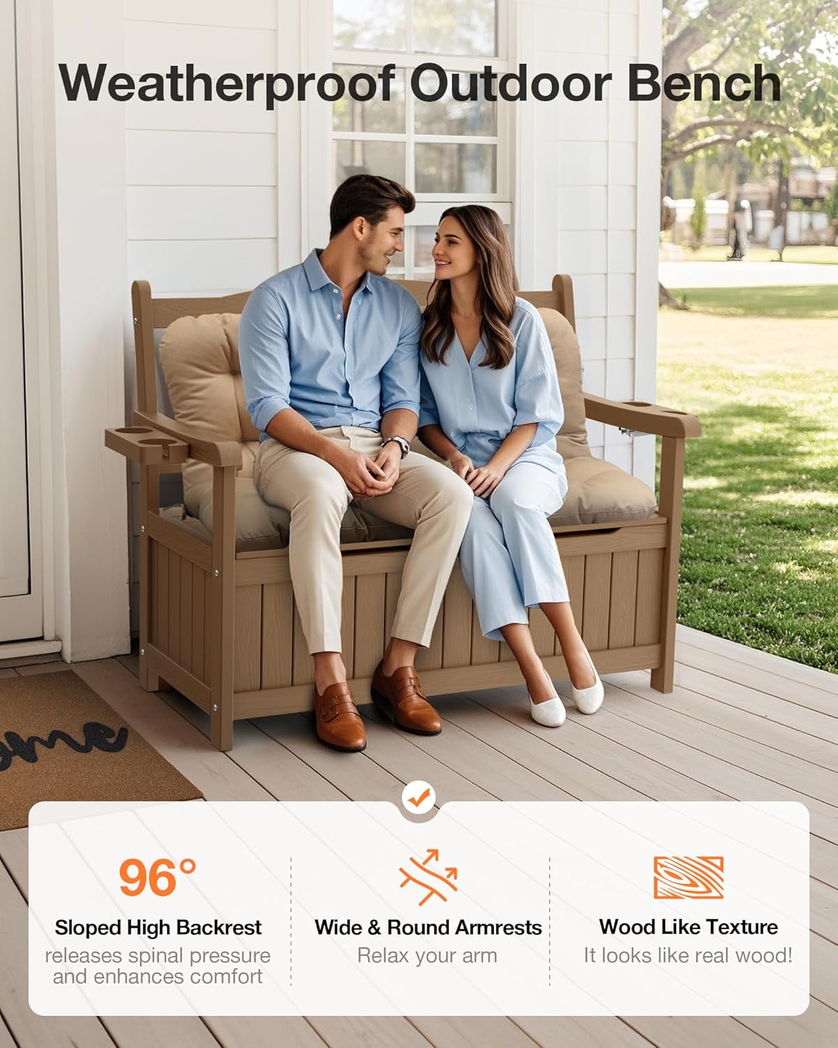 - Comfortable Seating Experience: The 96° sloped high backrest releases spinal pressure, relieves fatigue, and enhances comfort. The wide armrests, sturdy legs, and double-reinforcement garden benches frames are more stable and won’t shake, providing a more comfortable Experience.