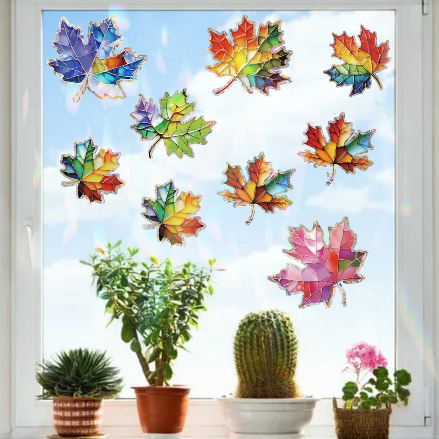 14pcs Window Decals for Bird Strikes, Anti Collision Window Clings, Rainbow Reflection Window Sticker, Maple Leaf Style Sun Catcher Stickers for Glass Windows