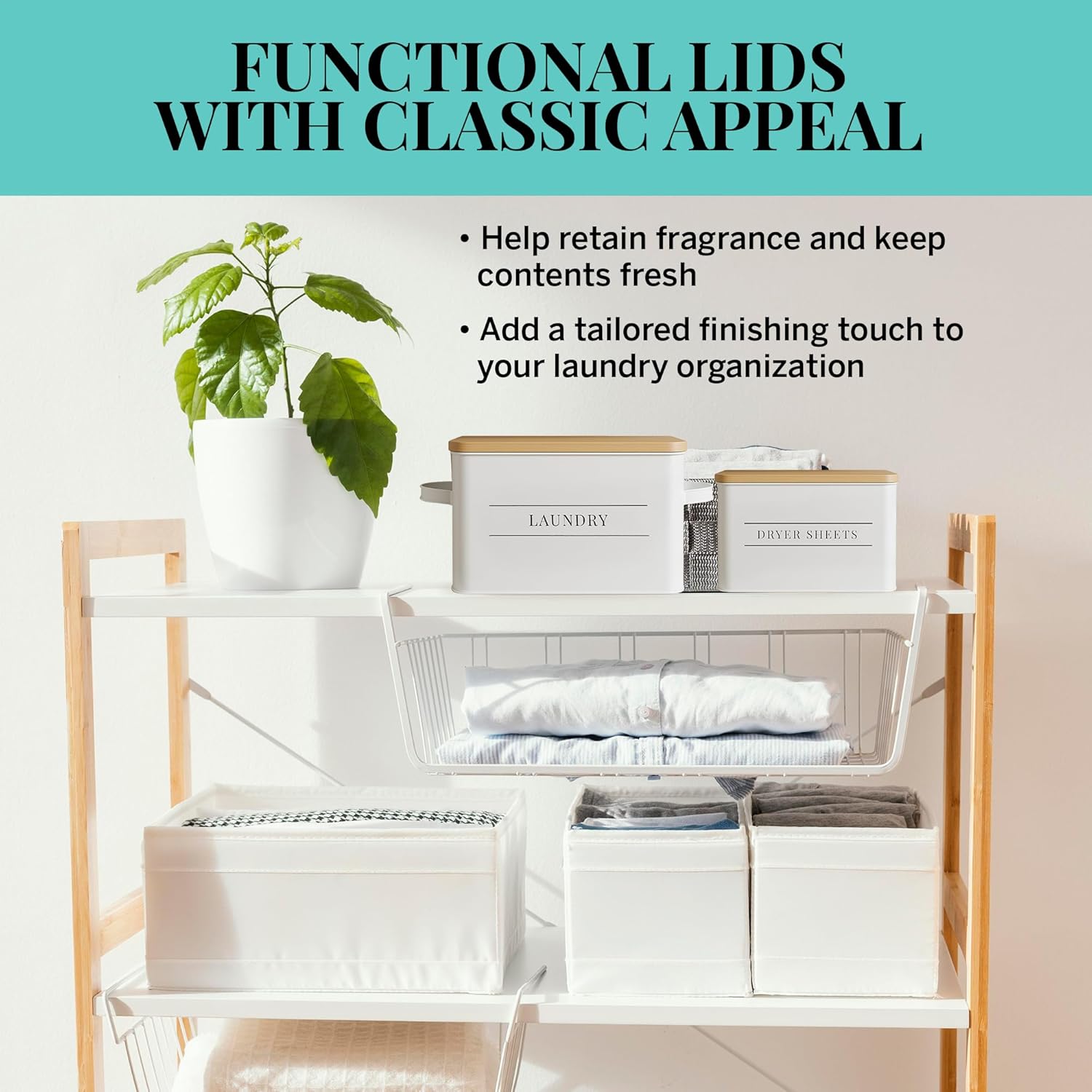 - Functional Lids with Classic Appeal – The lids help retain fragrance and keep contents fresh, all while adding a tailored finishing touch to your laundry organization. These storage bins with lids will be a lovely addition that enhances your laundry room storage.