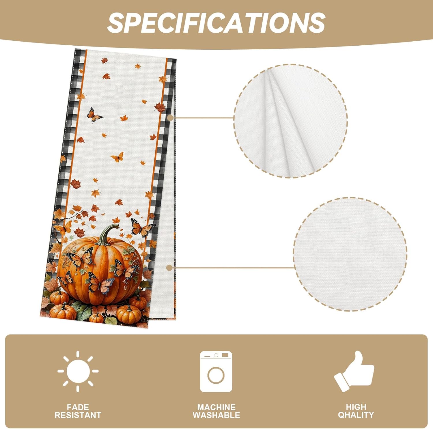 Linen Black and White Buffalo Check Plaid Fall Table Runner 72 Inches Long, Fall Leaves Pumpkin Butterfly Home Kitchen Table Decor, Farmhouse Autumn Thanksgiving Harvest Festival Decorations for Home