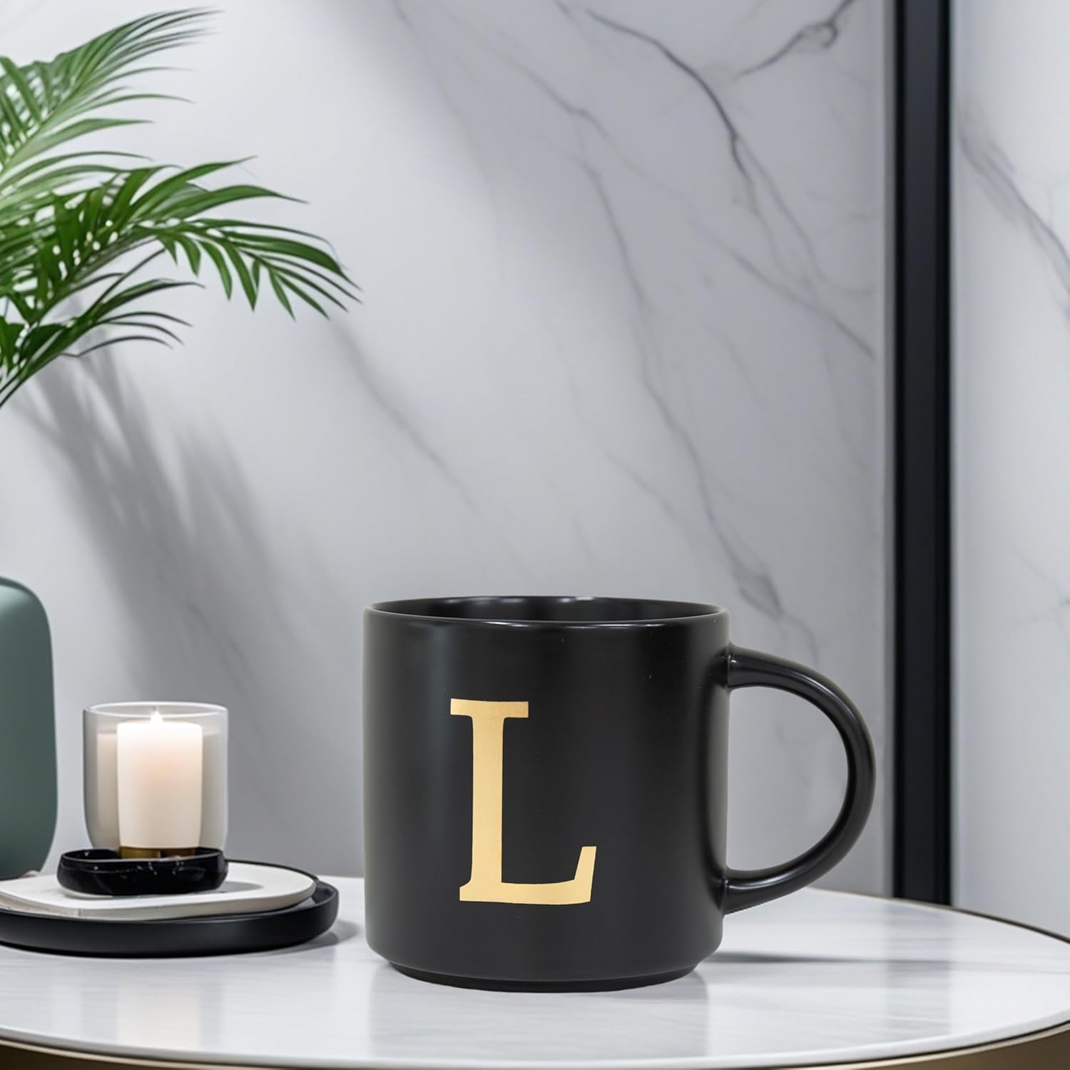 COLLECTIVE HOME - Monogram Ceramic Mugs, 15 oz Golden Initial Black Coffee Cups, Elegant Alphabet Tea Mugs, Elegant Personalized Mug with Gift Box, Unique Mug with Double Side Capital Lette (L)