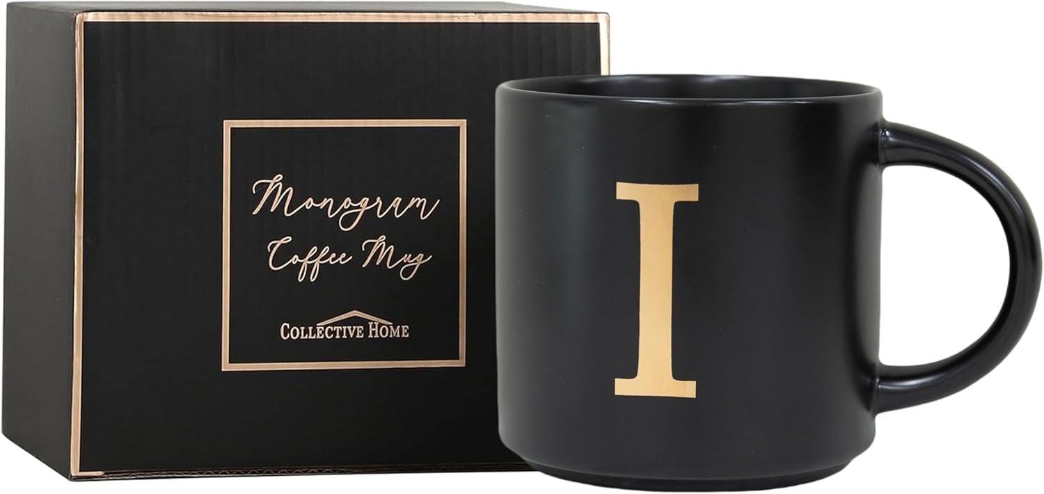 COLLECTIVE HOME - Monogram Ceramic Mugs, 15 oz Golden Initial Black Coffee Cups, Elegant Alphabet Tea Mugs, Elegant Personalized Mug with Gift Box, Unique Mug with Double Side Capital Lette (I)