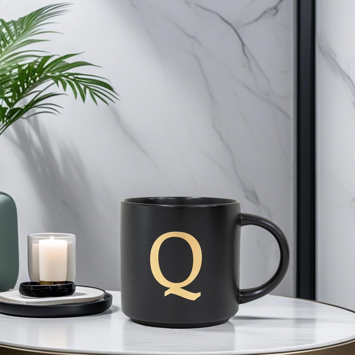 COLLECTIVE HOME - Monogram Ceramic Mugs, 15 oz Golden Initial Black Coffee Cups, Elegant Alphabet Tea Mugs, Elegant Personalized Mug with Gift Box, Unique Mug with Double Side Capital Lette (Q)