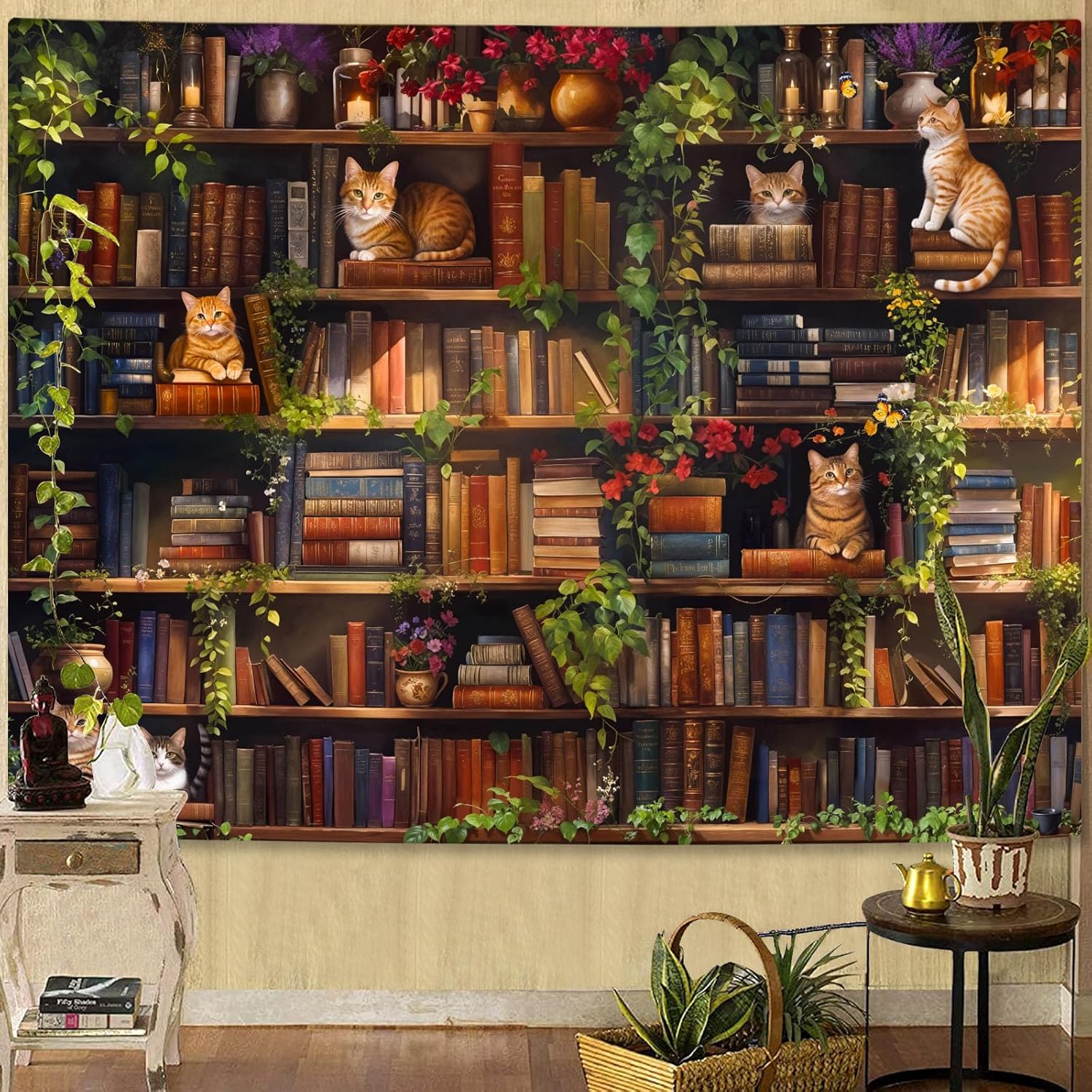 Accnicc Plant Cat Bookshelf Tapestry Botanical Floral Flower Cats Book Tapestries Wall Hanging Vintage Library Extra Large Tapestry for Bedroom Living Room Dorm 90 x 68 inch