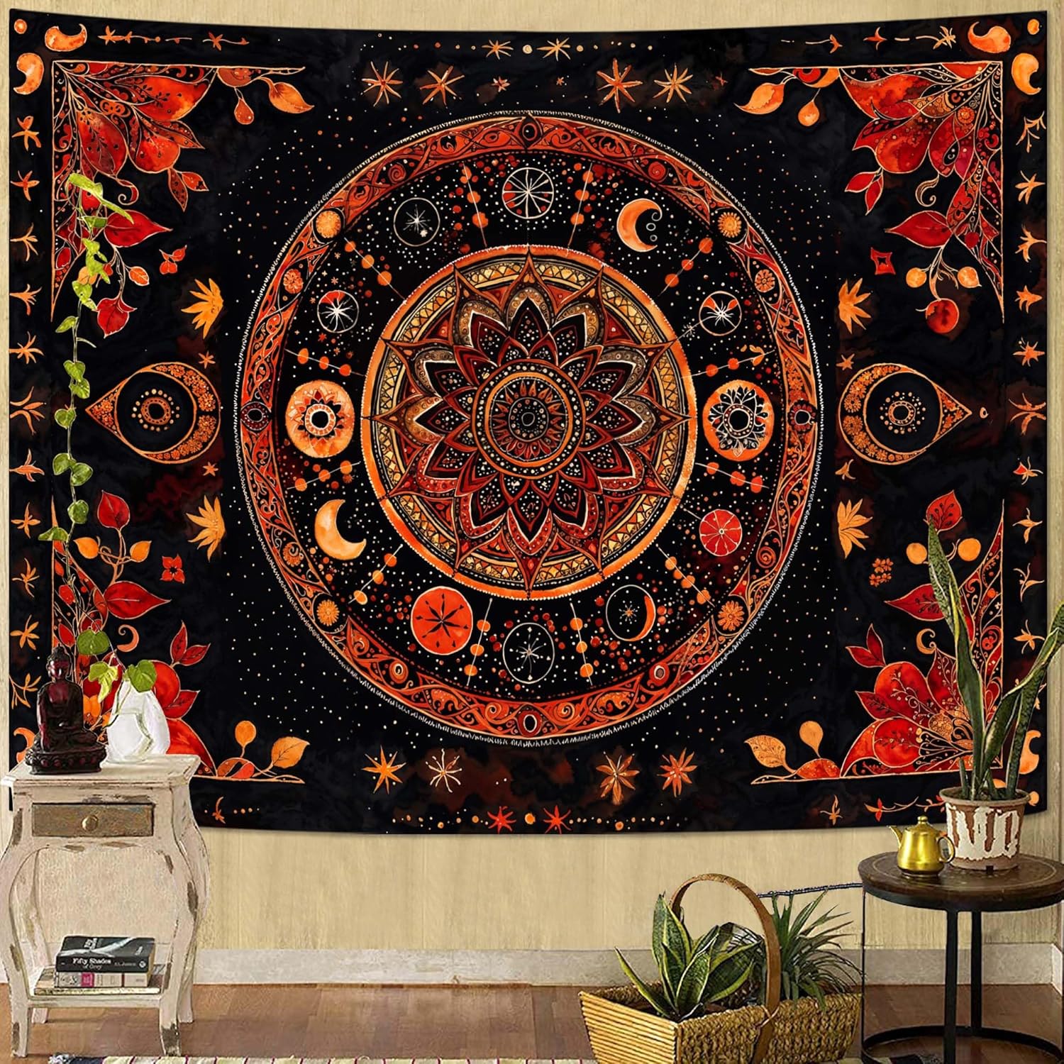 Lunerfex Mandala Moon and Stars Tapestry Boho Tapestry for Bedroom Black and Orange Tapestries Wall Hanging Living Room Wall Art and Home Decor 44x60