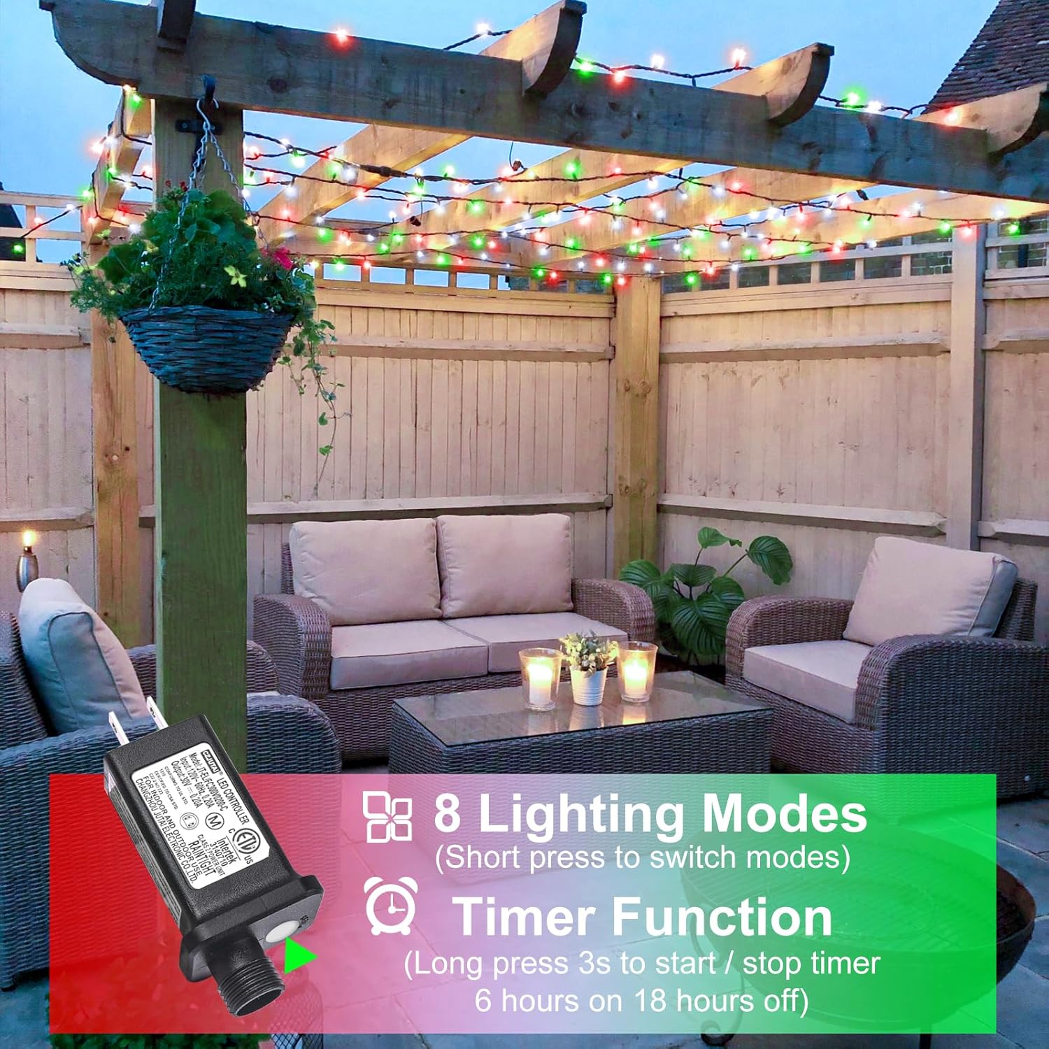 - ă8 Lighting Modesă: This string lights has 8 different lighting modes to choose from: combination, in waves, sequential, slog-glo, chasing/flash, slow fade, twinkle/flash, steady on. Press the button on the adapter to change the flashing modes. Moreover, built-in memory chip will save your last mode setting.