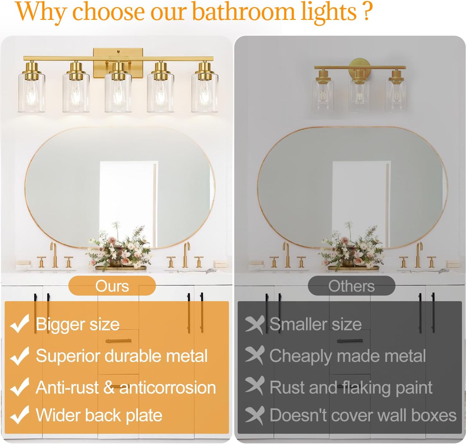 - Durable & Secure Construction: Made from premium metal, this brushed gold bathroom light fixture is built to last — the sturdy lamp arms won’t bend or warp easily. The upgraded finish adds a sleek, elegant look while resisting scratches, stains, and fingerprints, helping your light stay looking new for years to come.