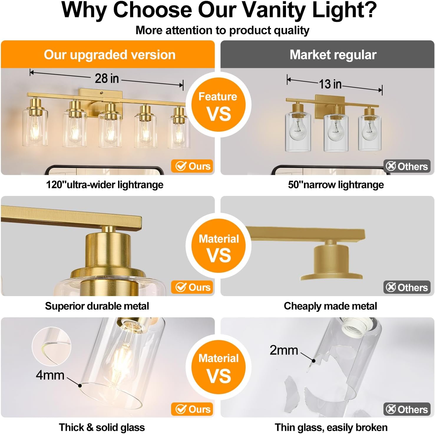 - 36-Month Warranty: Backed by a 36-month warranty, we guarantee the quality of our brushed gold vanity lights. If you encounter any issues, contact us via Amazon’s message box, and we’ll respond within 24 hours to provide troubleshooting or a replacement.