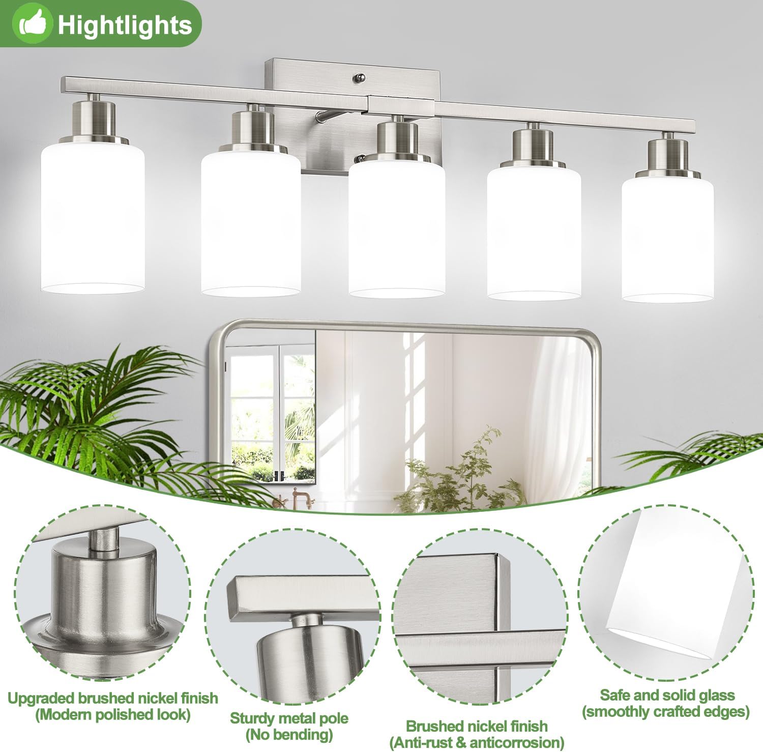 - Elegant Brushed Nickel Finish: Crafted with a sleek brushed nickel frame and protective coating, this bathroom vanity light resists scratches, tarnish, and fingerprints. It keeps its shine while adding a touch of modern sophistication to any space.