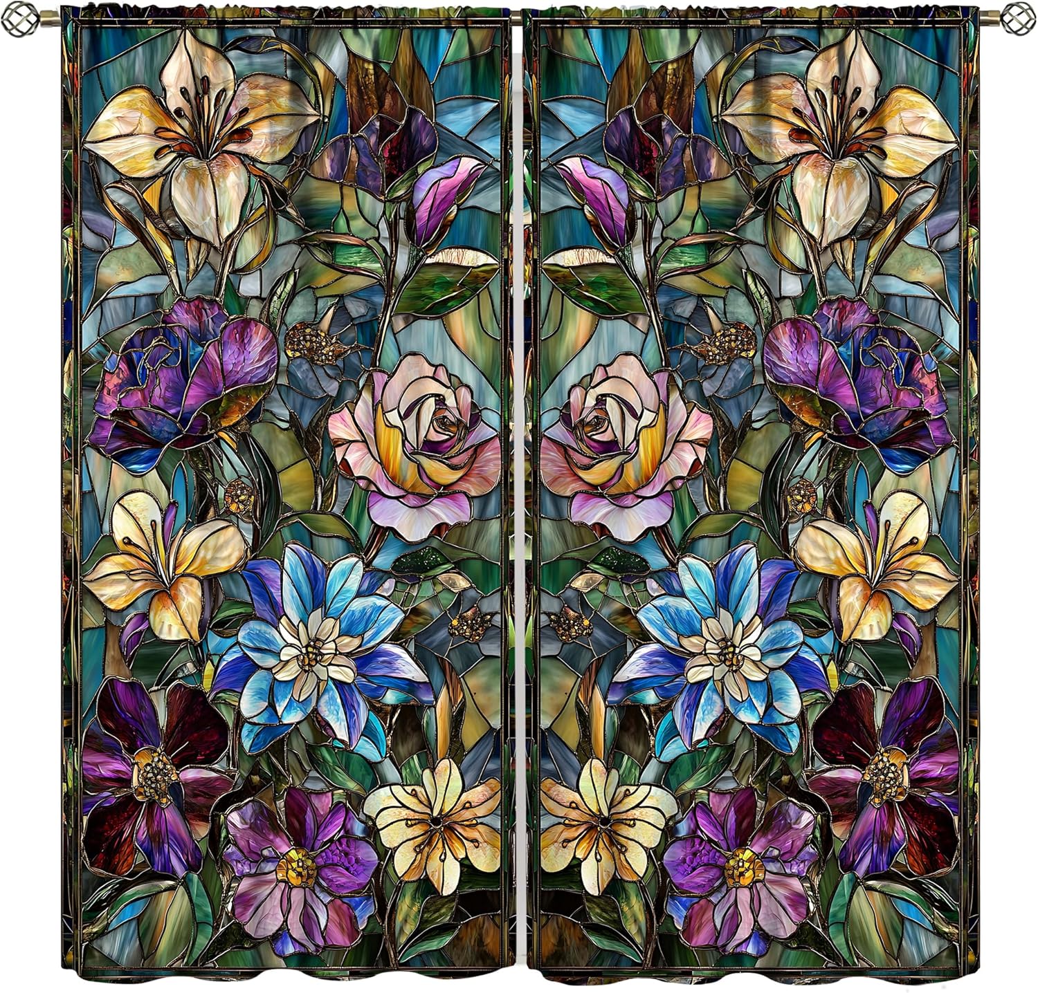 Stained Glass Curtains,Retro Colored Glass Flowers Art Home Decor Drapes for Bedroom Living Room Kitchen Window Treatment 2 Panels Set Total Size 84" W X 84" L Inch