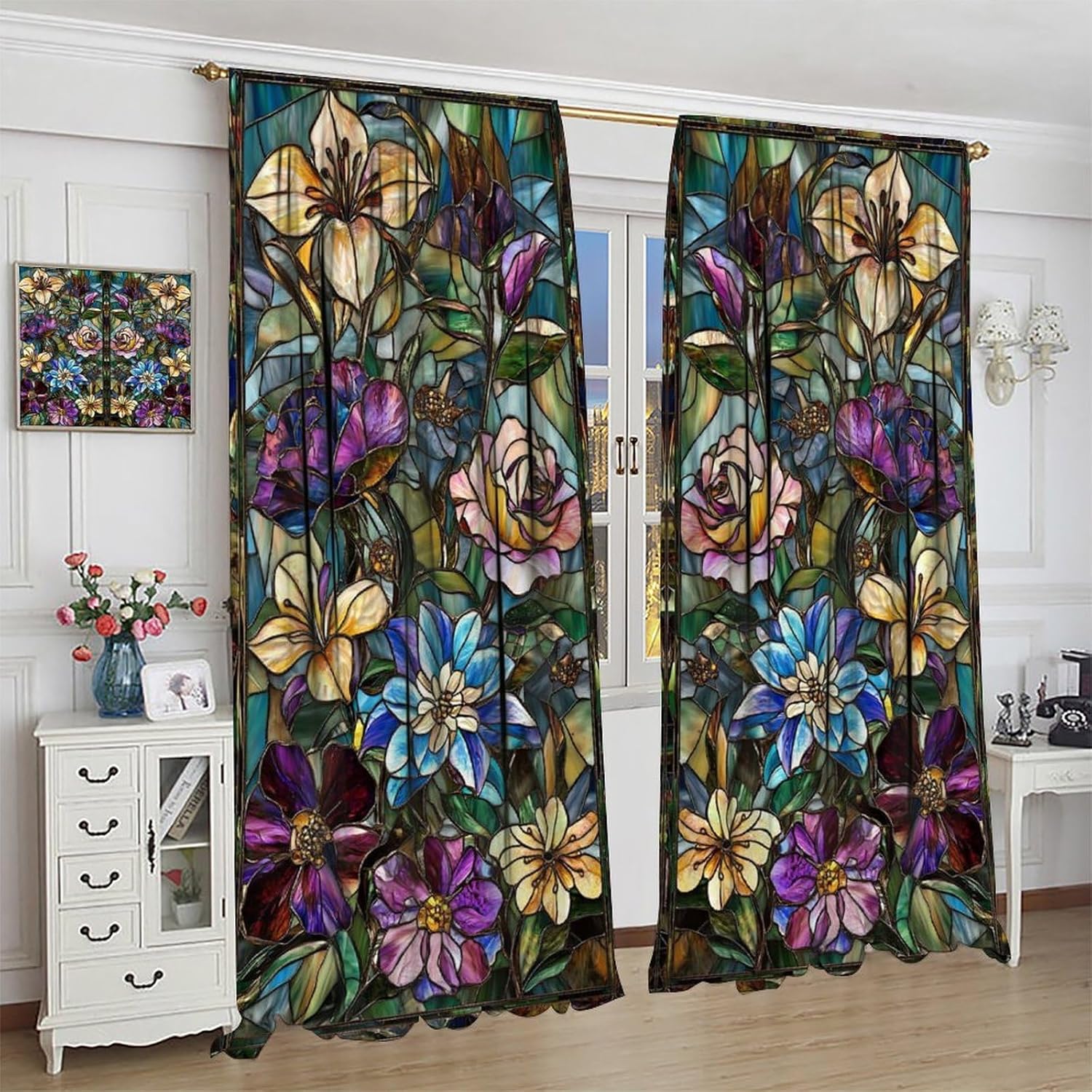 Stained Glass Curtains,Retro Colored Glass Flowers Art Home Decor Drapes for Bedroom Living Room Kitchen Window Treatment 2 Panels Set Total Size 42" W X 54" L Inch
