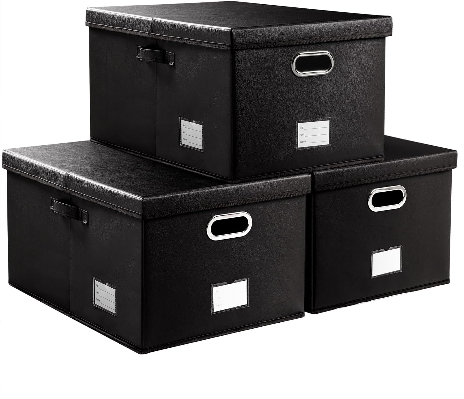 PRANDOM Collapsible Storage Box with Lid [3-Pack] Leather Fabric Foldable Storage Bin Organizer Container Basket Cube with Cover for Home Bedroom Closet Office Nursery Black(22.8X15.7X11.8)