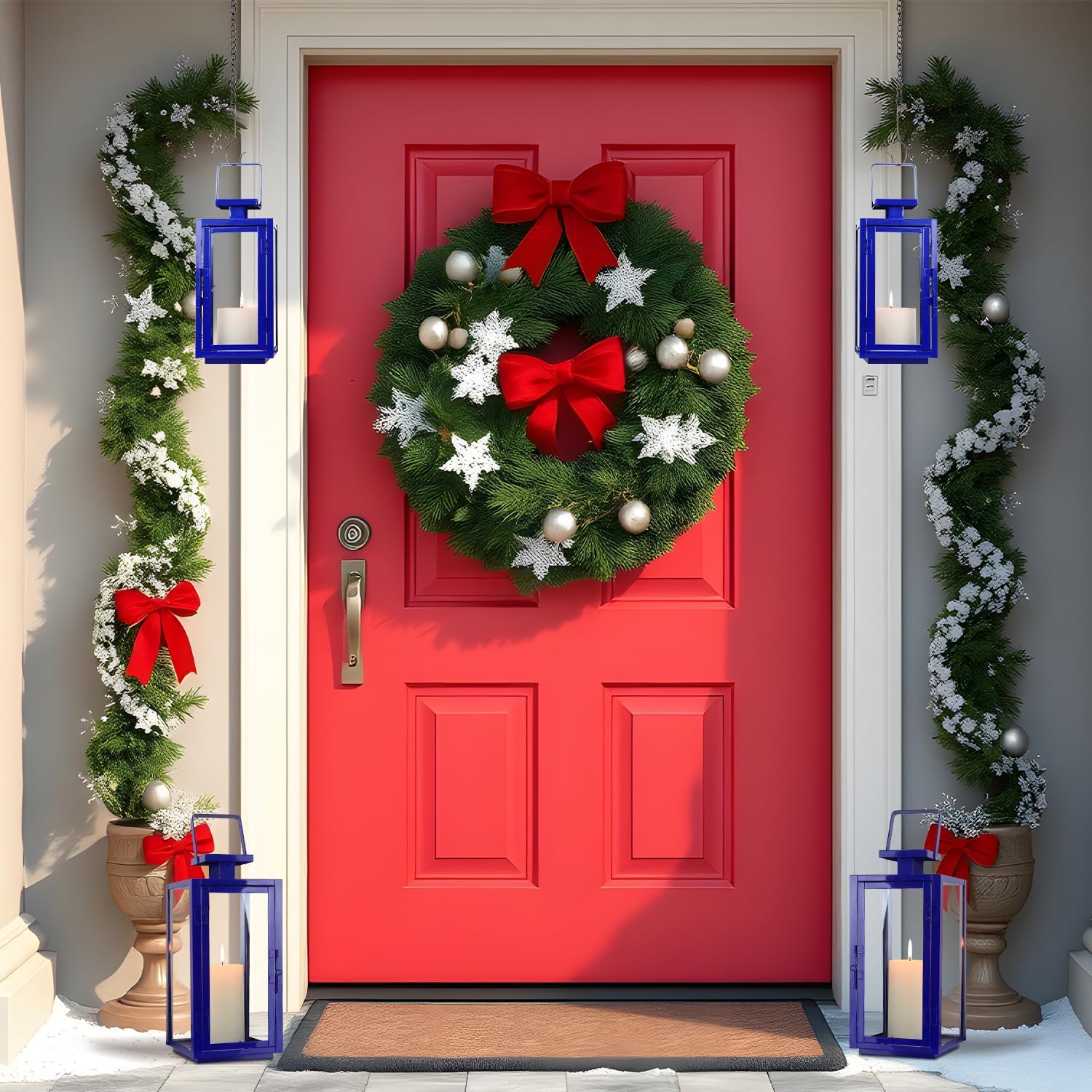 DECORKEY Lantern Decorative Outdoor&Indoor, 17''&13'' Set of 2 Blue Metal Candle Lanterns Decor, Modern Hanging/Tabletop Candle Holders for Home Porch Patio Wedding Christmas Fall Decorations