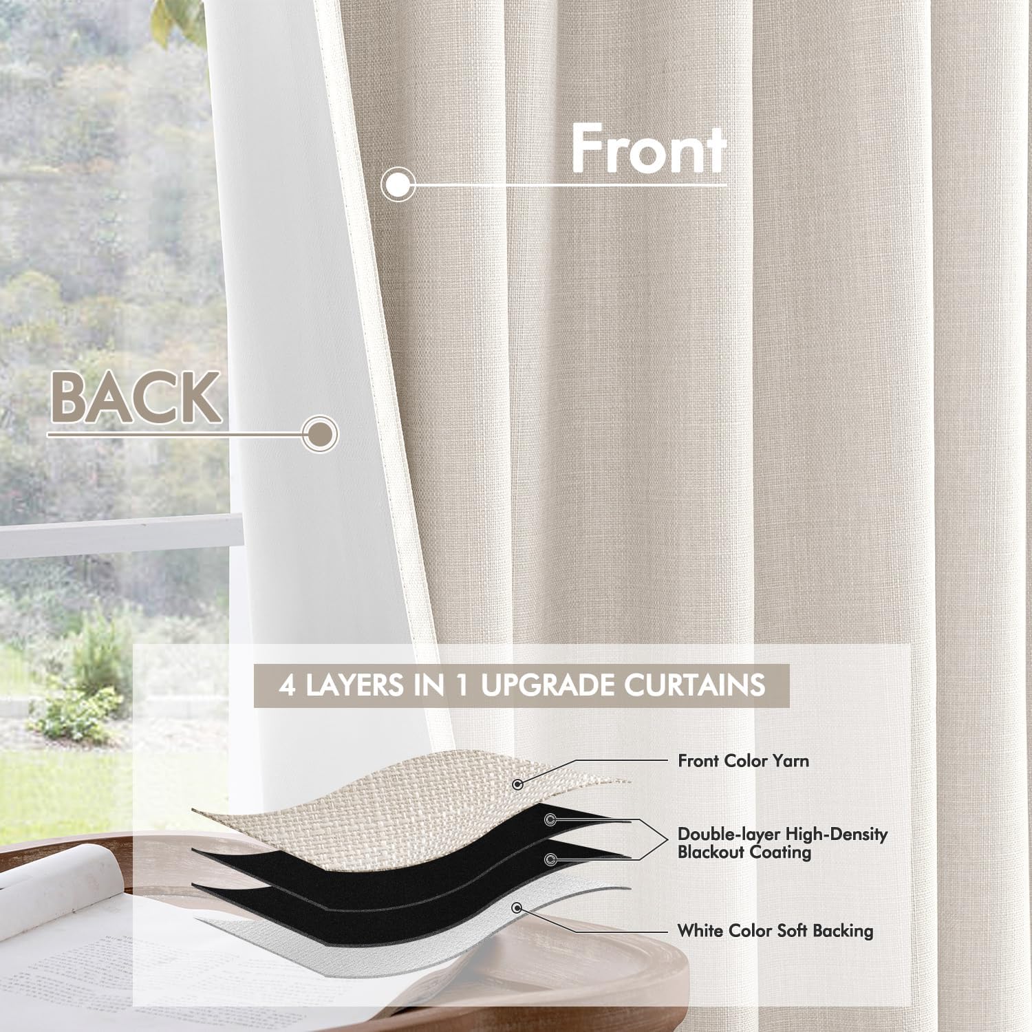 - INNOVATED MATERIAL: Crafted from premium thick linen-like fabric with a substantial weight of 350 GSM, these curtains surpass standard blackout options in thickness, luxurious texture, and functionality. The advanced four-layer coating ensures 100% light blocking, insulation against heat and cold, and effective noise reduction. The vintage burlap texture adds timeless charm and highlights their high-quality feel. Energy-efficient and durable, they provide privacy and a cozy atmosphere year-round