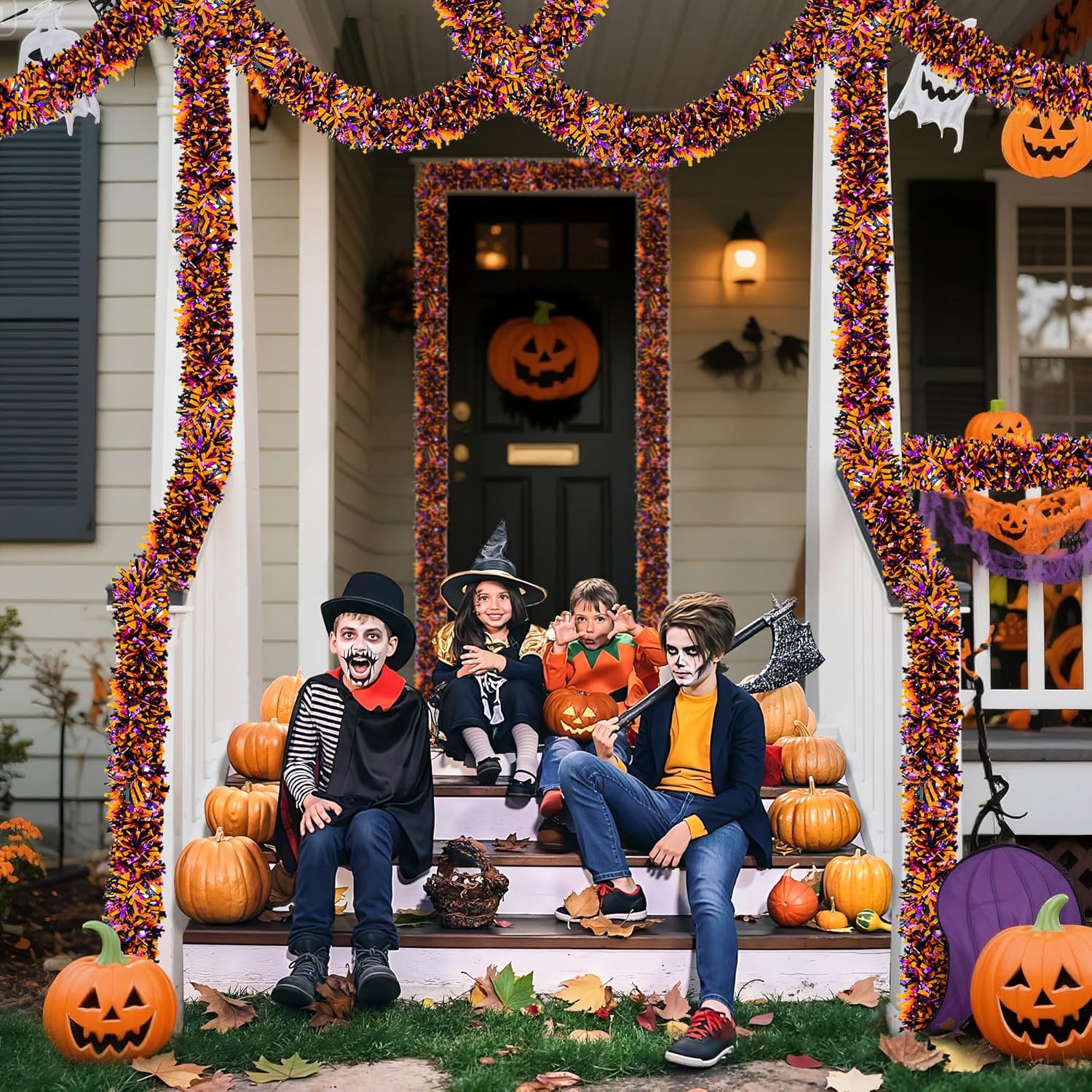 50FT Halloween Decorations Tinsel Garland, Orange Purple Black Shiny Metallic Tinsel Twist Hanging Streamers Garland for Halloween Birthday Home Tree Banister Indoor Outdoor Party Decor Supplies