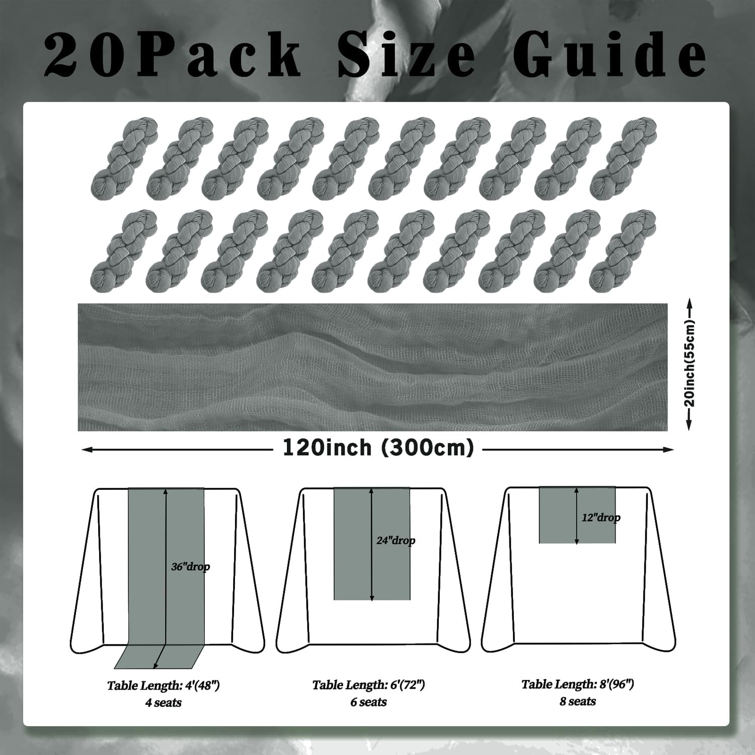 - Cheesecloth Table Runner Size: You will receive 20 gray cheesecloth tablerunner, each measuring 20 x 120 inches. The quantity is sufficient for you to decorate various romantic occasions. It can decorate most shaped tables, such as rectangular tables, round tables, and cocktail tables. It is long enough to decorate a large table and be placed perfectly and elegantly on the tabletop, adding a romantic atmosphere to your occasion.