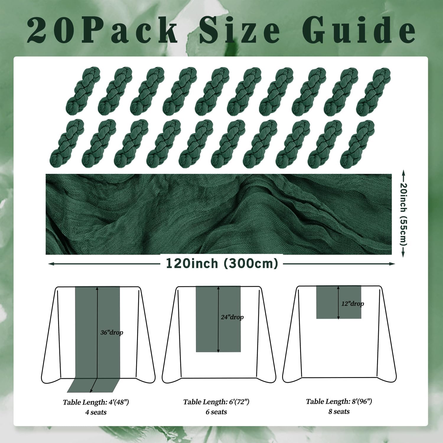 - Cheesecloth Table Runner Size: You will receive 20 emerald green cheesecloth tablerunner, each measuring 20 x 120 inches. The quantity is sufficient for you to decorate various romantic occasions. It can decorate most shaped tables, such as rectangular tables, round tables, and cocktail tables. It is long enough to decorate a large table and be placed perfectly and elegantly on the tabletop, adding a romantic atmosphere to your occasion.