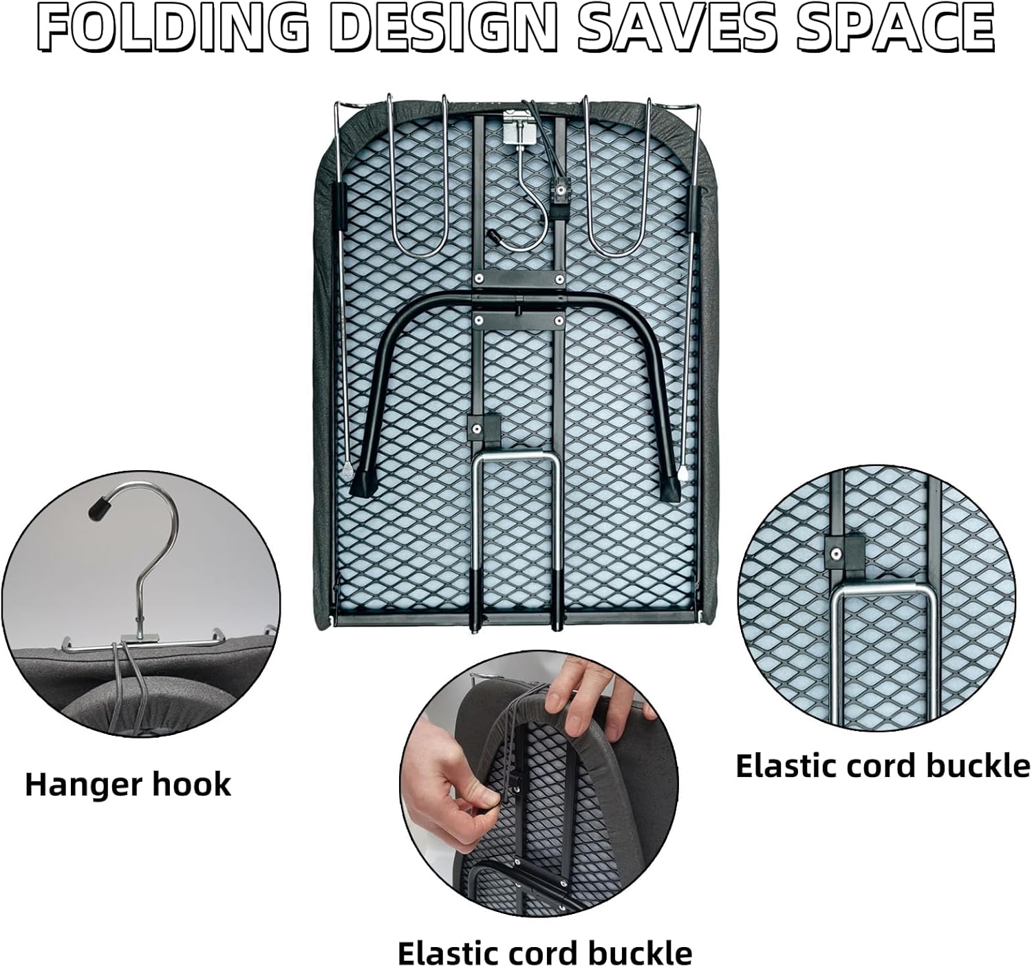 - 【Smart Storage Solutions】 Integrated elastic strap secures folded board; wall hook enables vertical storage. Dampened safety hinge prevents accidental opening. ironing board cover and pad no assembly needed – ready to use instantly!