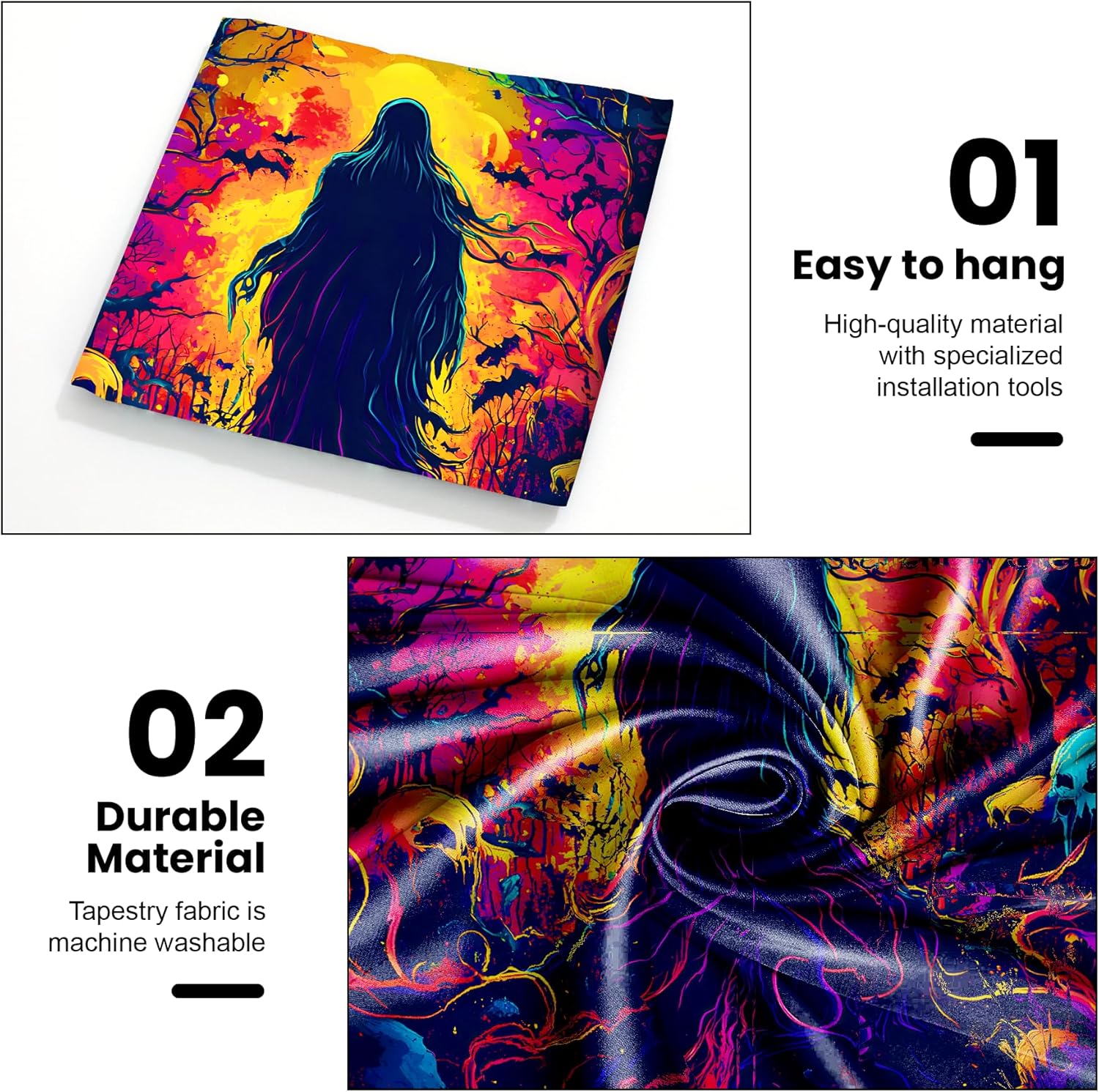 - 【Spooky UV Magic】This Halloween tapestry glows vividly under blacklight, creating an eerie, eye-catching display perfect for haunted houses, parties, or year-round horror-themed decor.
