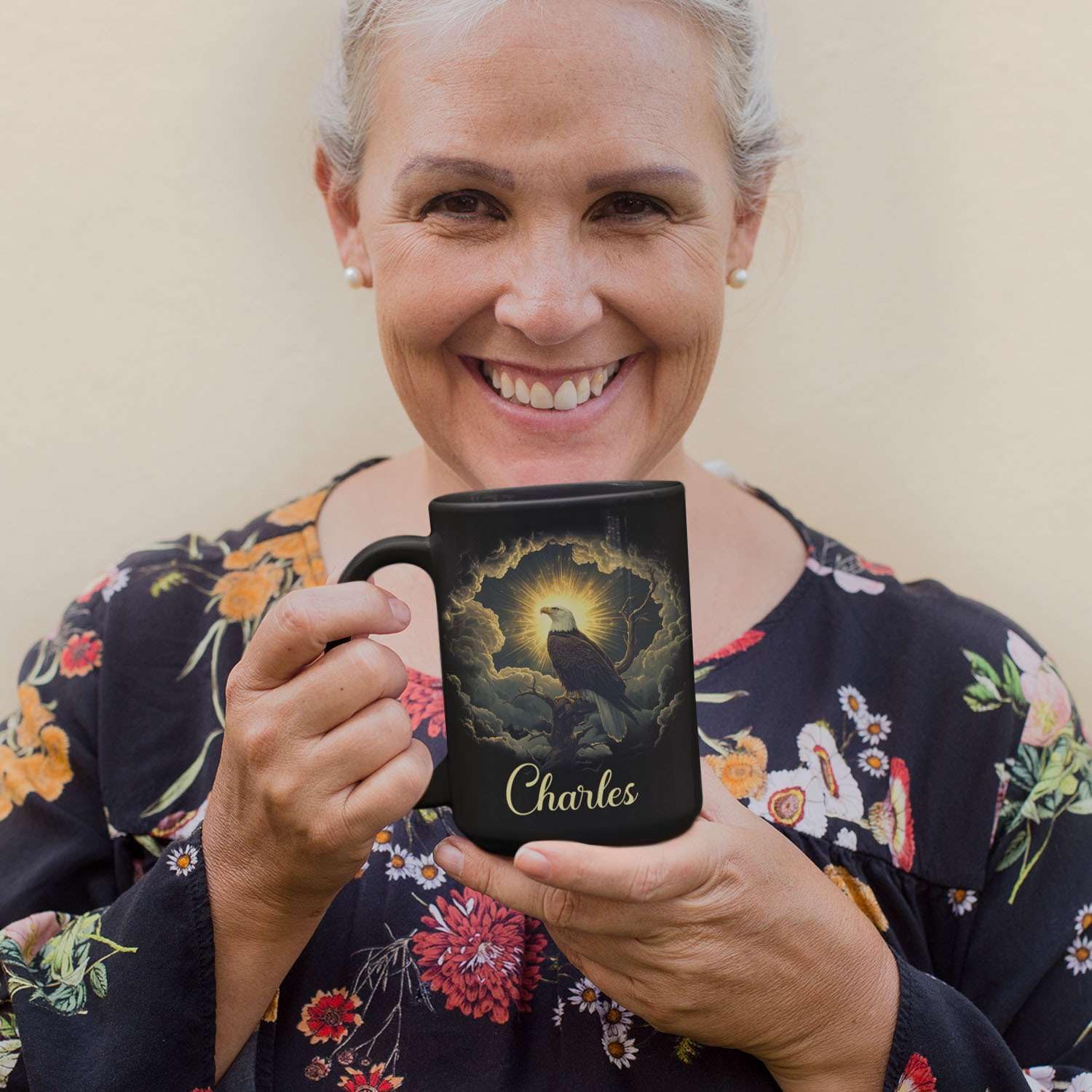 Custom Name Coffee Mug 11oz or 15oz, Unique Wildlife Art Black Cup, Personalized Eagle Ceramic Mug for Animal Lovers, Inspirational Coffee Cup with Nature Scene, Gifts for Friends