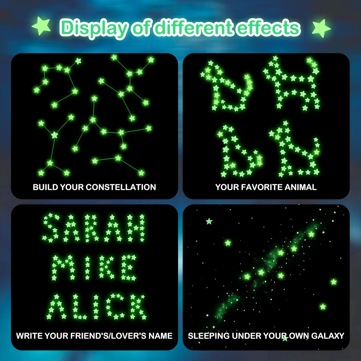 - Improved sleeping environment: Glow in the dark ceiling stickers create a soothing starry sky effect in a dim room. The soft green light reduces spatial disorientation at night, helping you relax and helping your child fall asleep faster. Arrange a star pattern above the head of the bed to turn an ordinary ceiling into a soothing visual aid to improve the sleep cycle