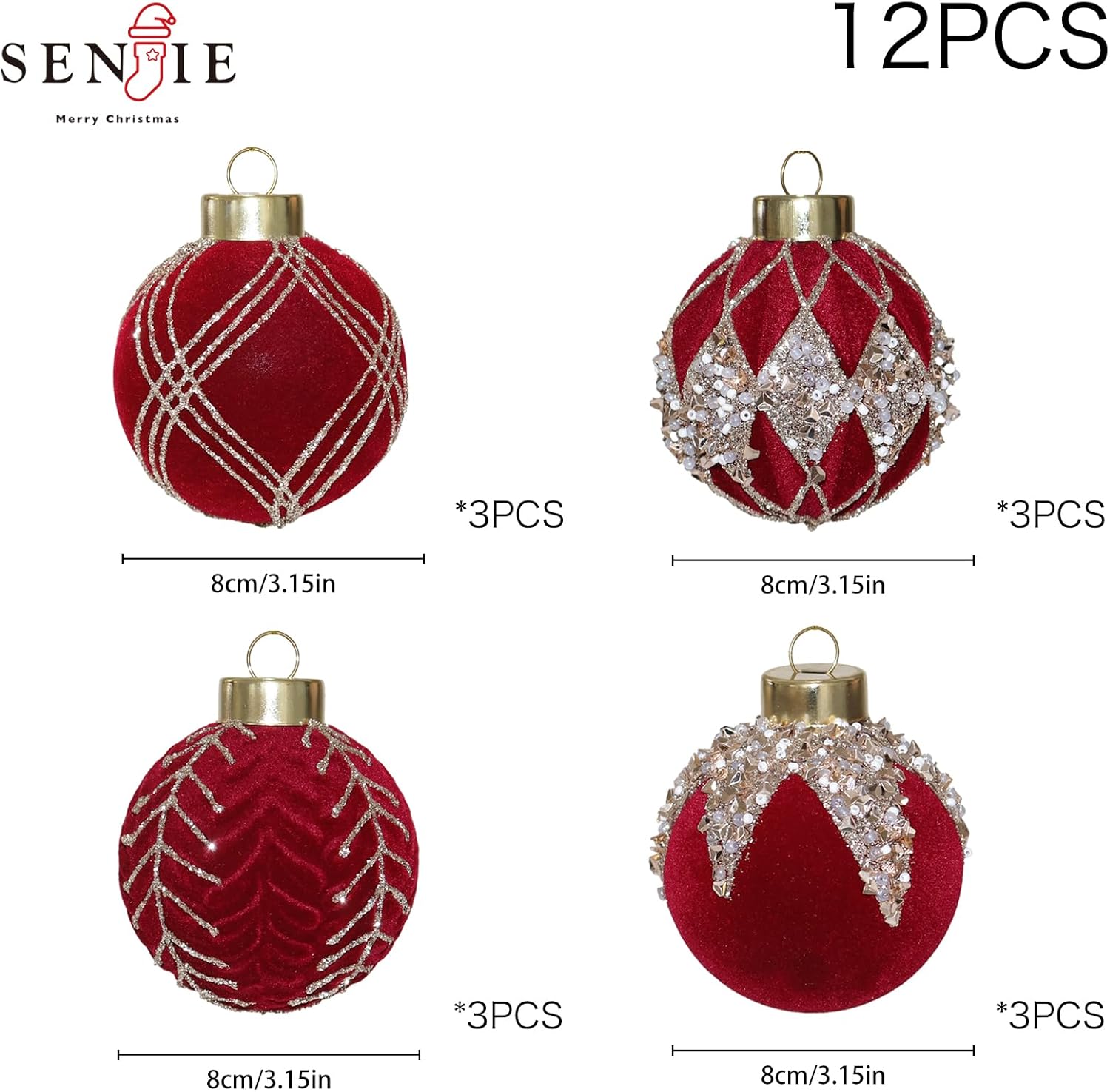 3.15INCH Burgundy Velvet Ornaments for Christmas Tree, 12PCS Glitter Flocked Christmas Ornaments Decorations Balls Set Decor