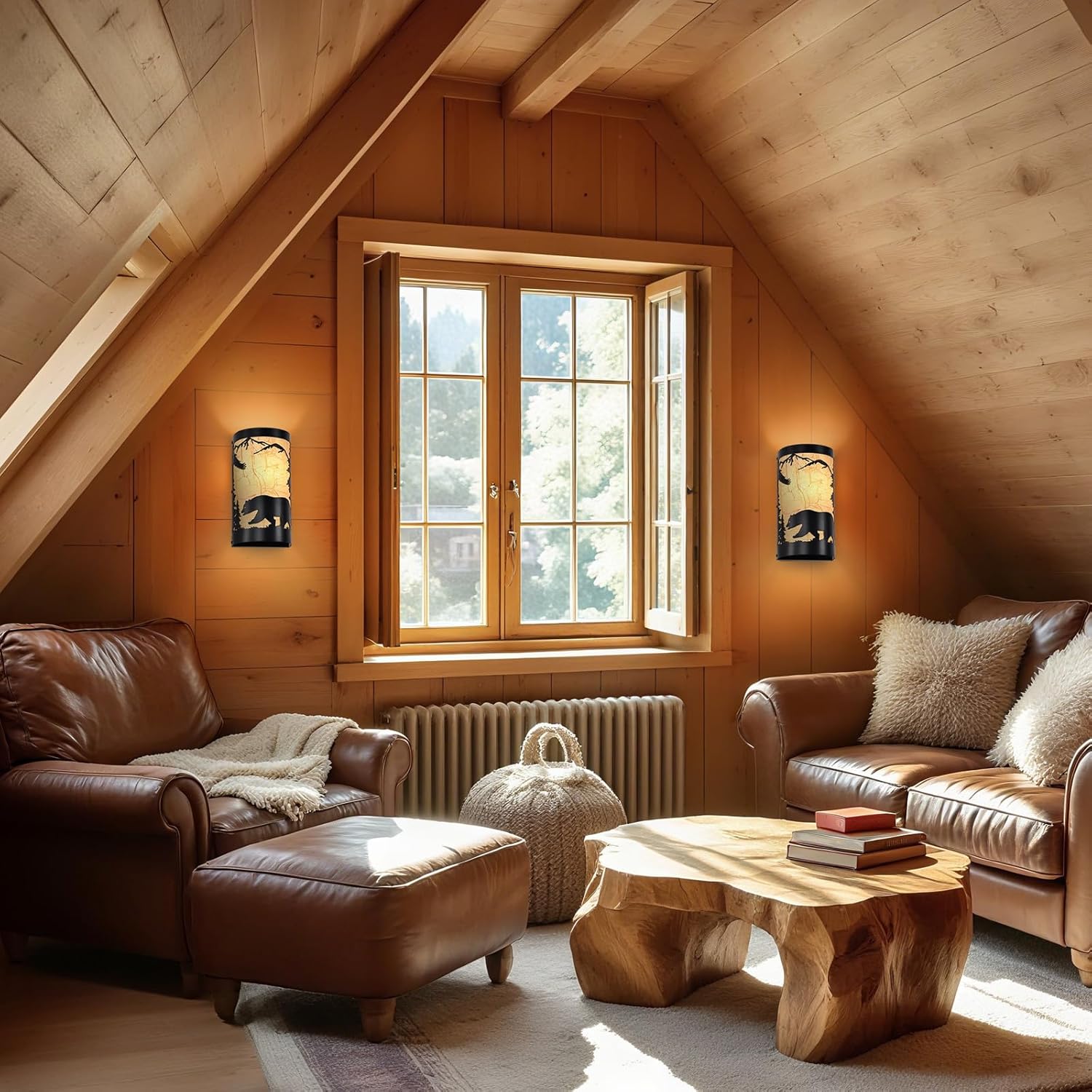 - Rustic Design:The wall sconce light is crafted from durable matte black metal,featuring intricate forest elements and a bear silhouette,yellow parchment paper adds a soft,warm glow,enhancing industrial aesthetic of the vintage wall sconce