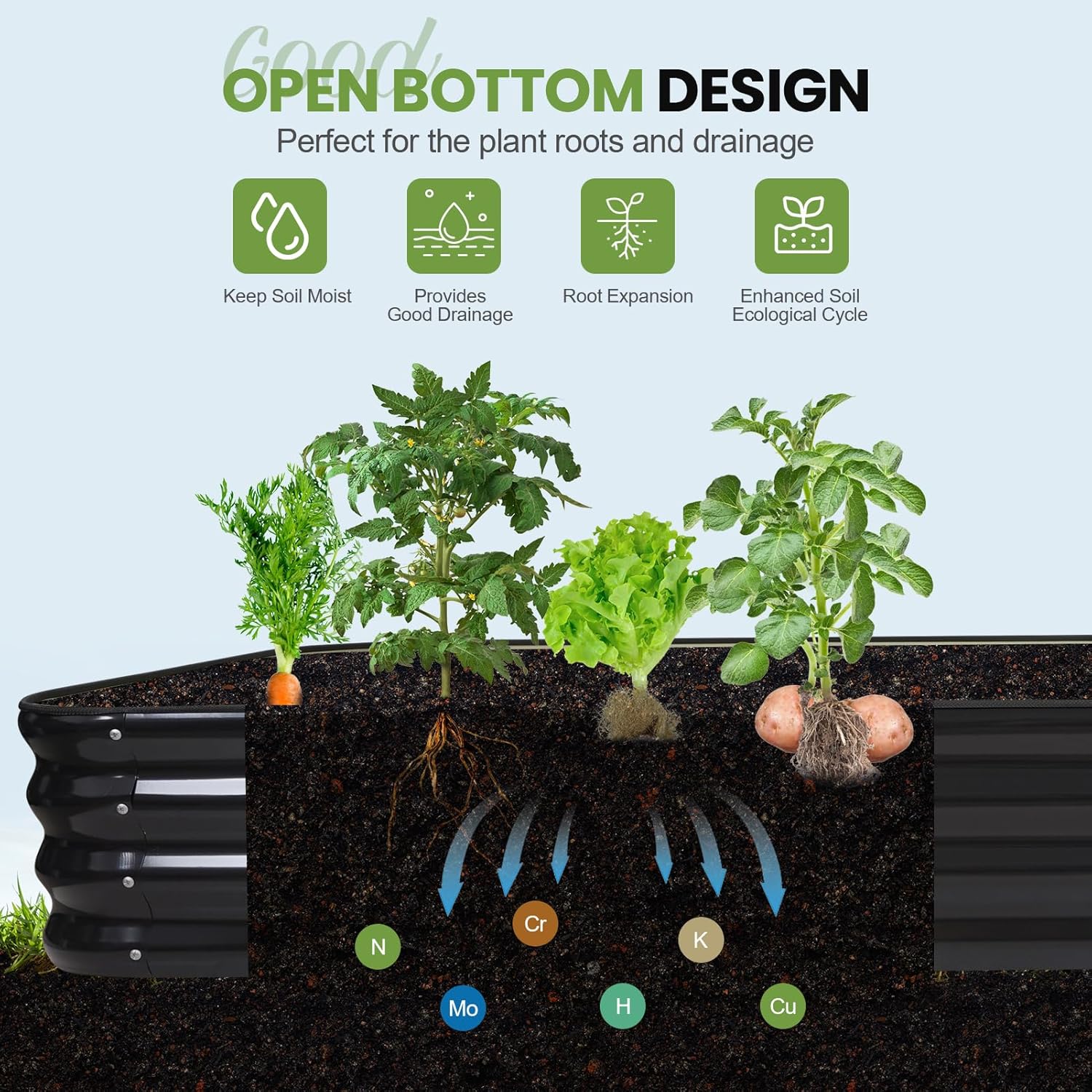 - Root-Friendly Drainage: Open-bottom design prevents waterlogging and root rot while promoting nutrient absorption. Made with galvanized materials to protect soil integrity, ensuring healthy growth of vegetables, herbs, flowers, and fruits