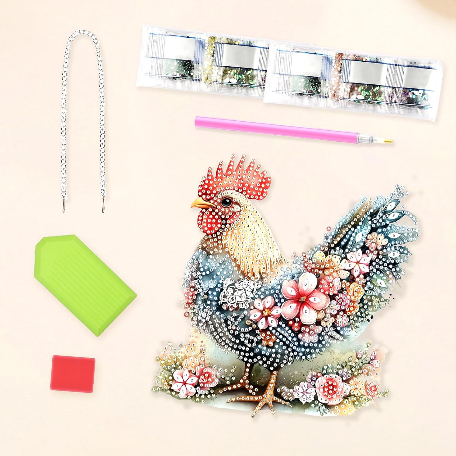 Lxmsja DIY Chicken Flowers Diamond Painting Hanging Ornament, Double-Sided Acrylic Sceney Diamond Art Kit, Special Shaped Drill Pendant Window Art Kit, Suncatcher Hanging Craft Decoration 8x7 inch