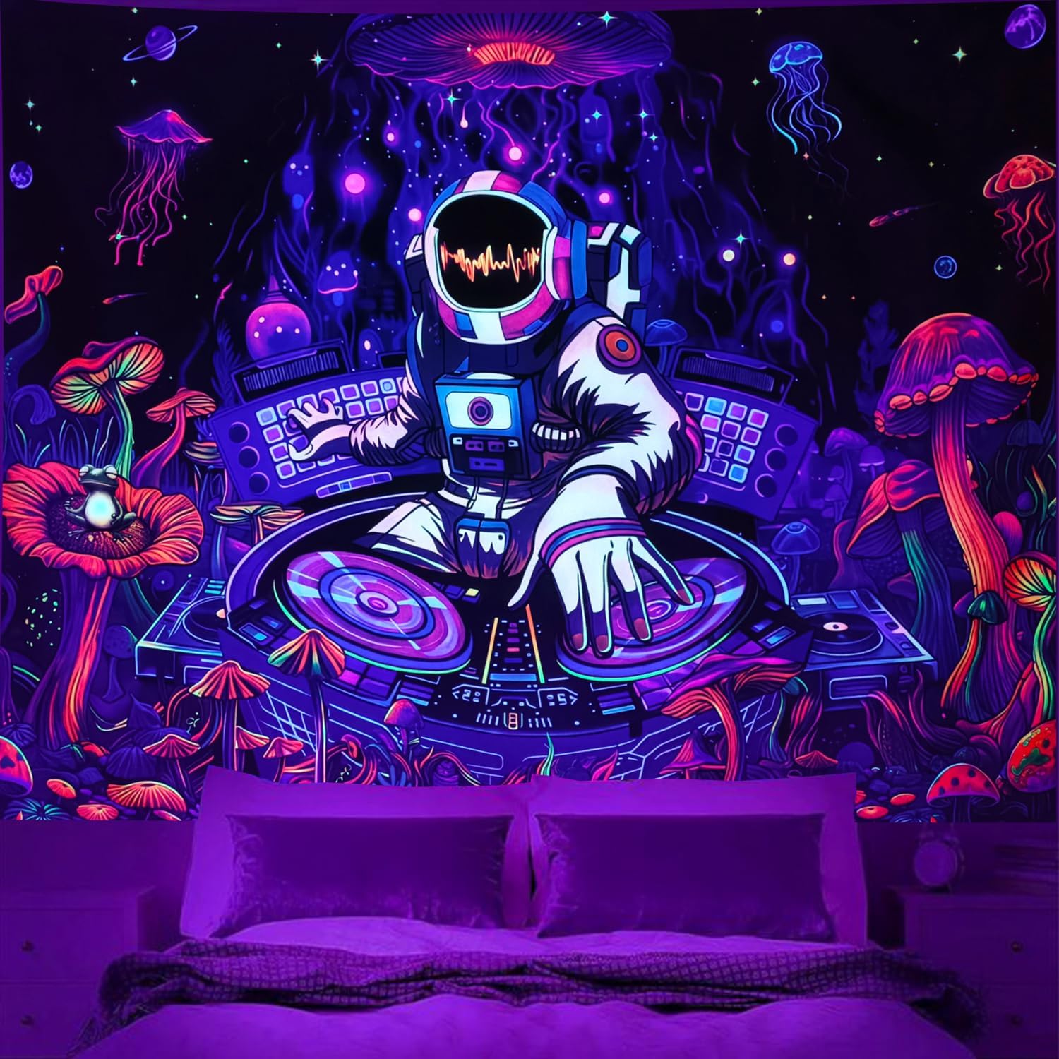 Blacklight Astronaut Tapestry Glow In The Dark Funny DJ Music Tapestry UV Reactive Space Galaxy Planet Mushroom Floral Jellyfish Frog Tapestries Wall Hanging for Home Dorm Living Room Decor W59×H51