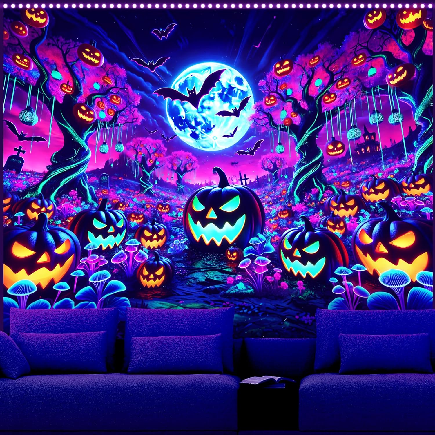 AOHMPT Glow-in-the-Dark Halloween Tapestry - UV Reactive Black Light Wall Hanging Decor for Spooky Parties, Bedroom, Living Room (Pumpkin-Bat, 79L x 59W, Unframed)