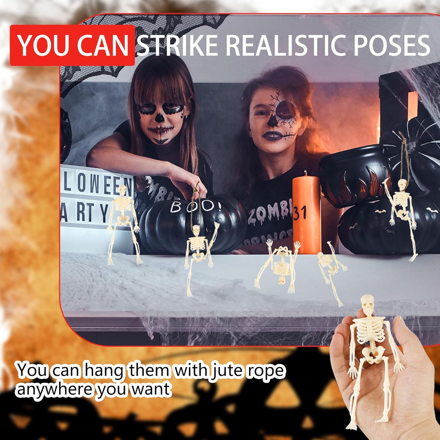 - Package details: You will receive 30 pcs of 6in mini skeleton toys and two 10m jute ropes that require no assembly, are easy to use and add a spooky touch to your Halloween decorations