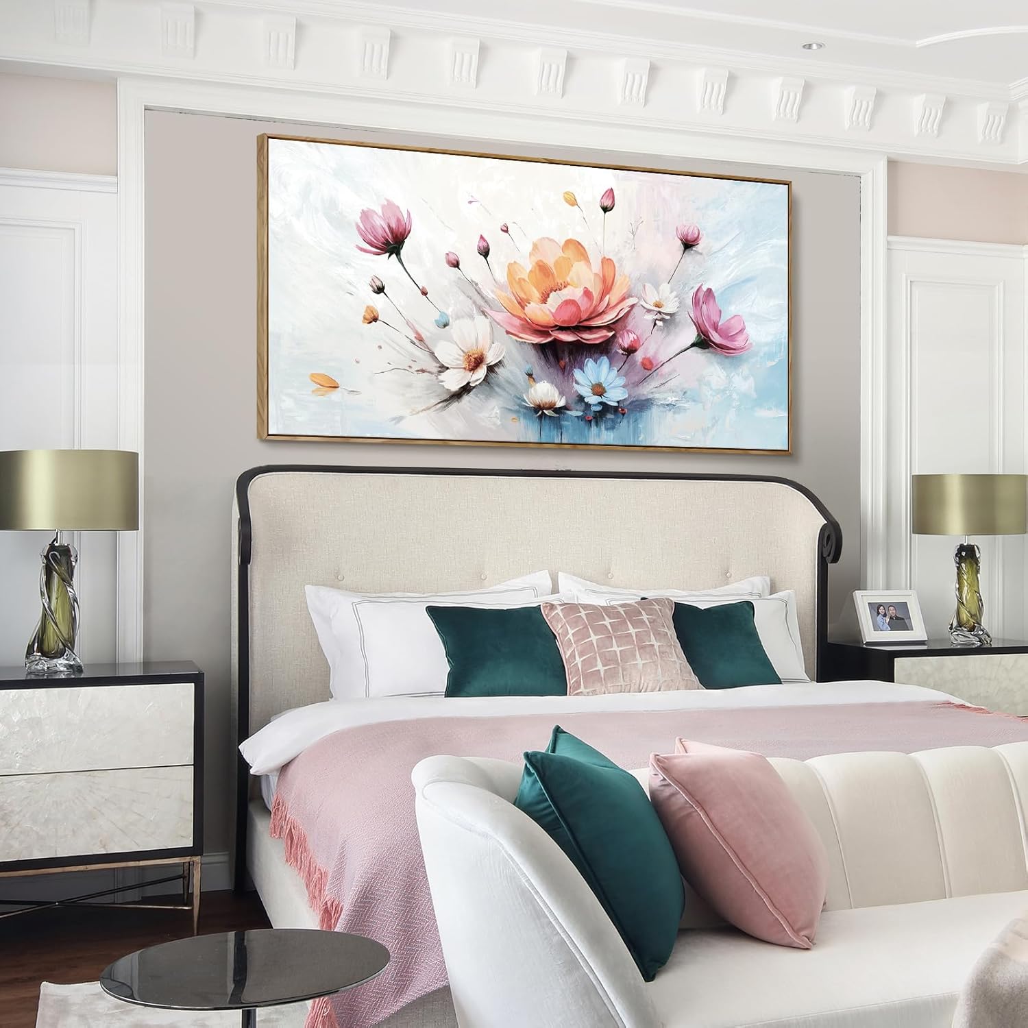 amatop Framed Floral Canvas Wall Art – Oversized Pink Blue Abstract Bloom Flower Print Daisy & Peony Picture Elegant Botanical Nature Large Artwork for Living Room Bedroom Dining Entryway Decor 58x29 inch