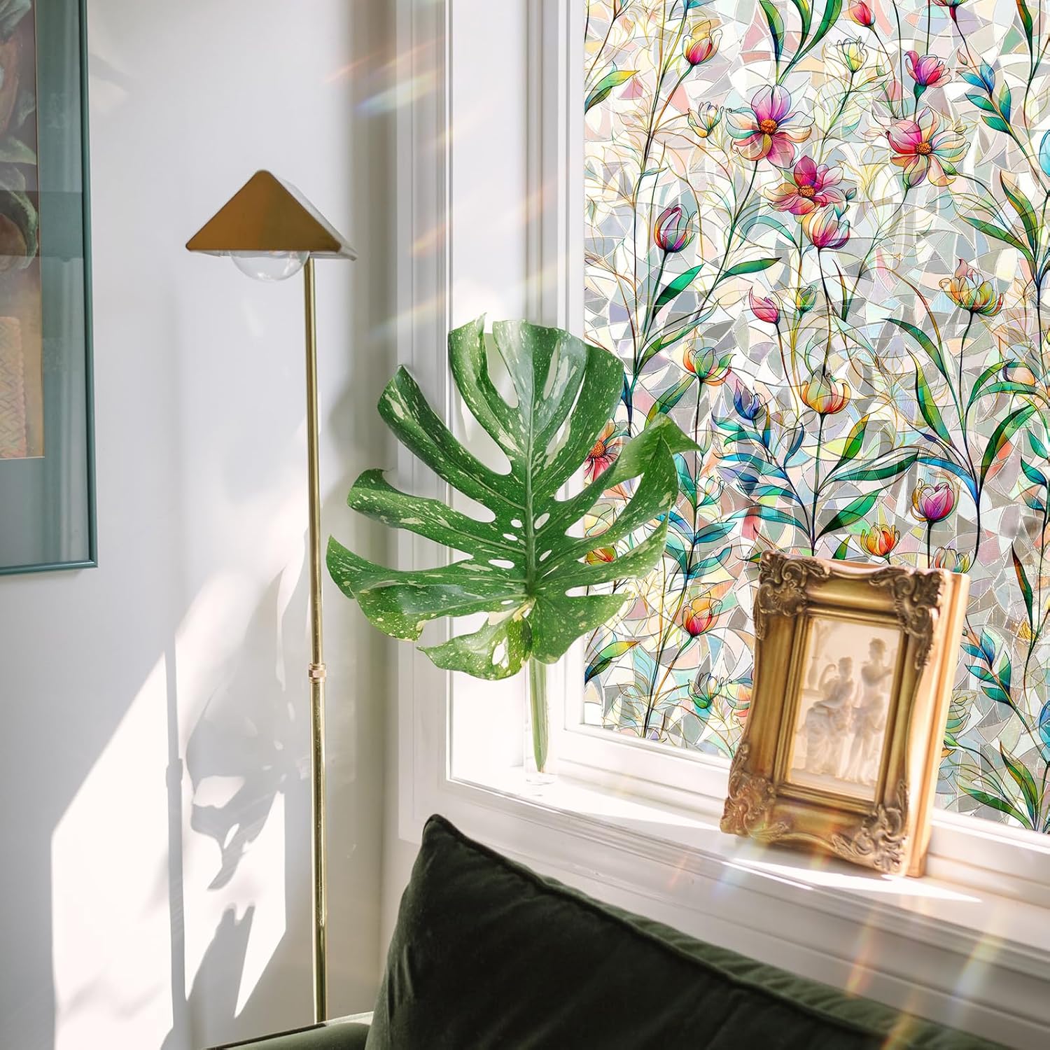 Rainbow Window Privacy Film 3D Floral Decorative Stained Glass Window Film Anti UV Non-Adhesive Reusable 23.6" x 78.7" for Home Room Car Glass Cling