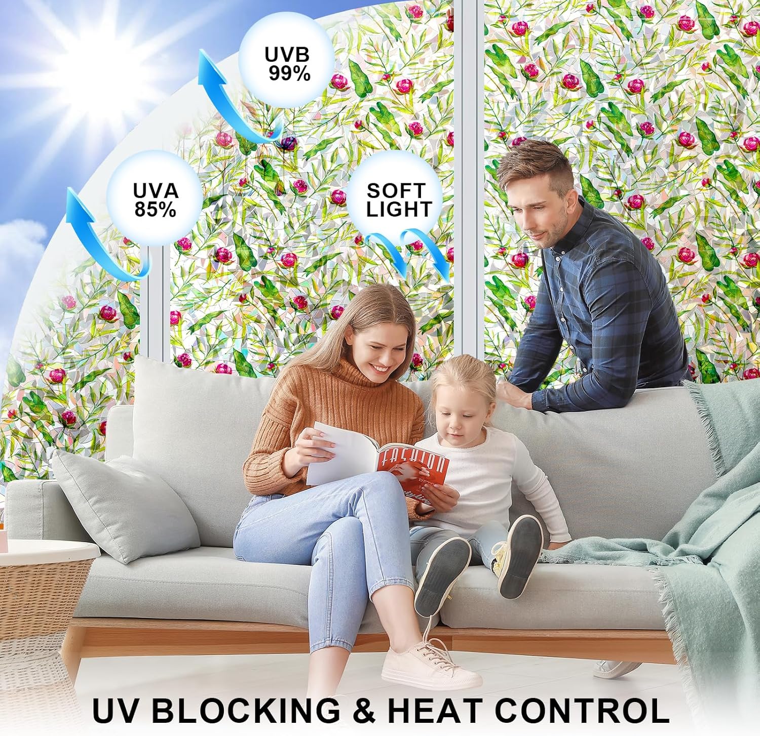 Rainbow Window Privacy Film 3D Floral Decorative Stained Glass Window Film Anti UV Non-Adhesive Reusable 17.5" x 157.4" for Home Room Car Glass Cling
